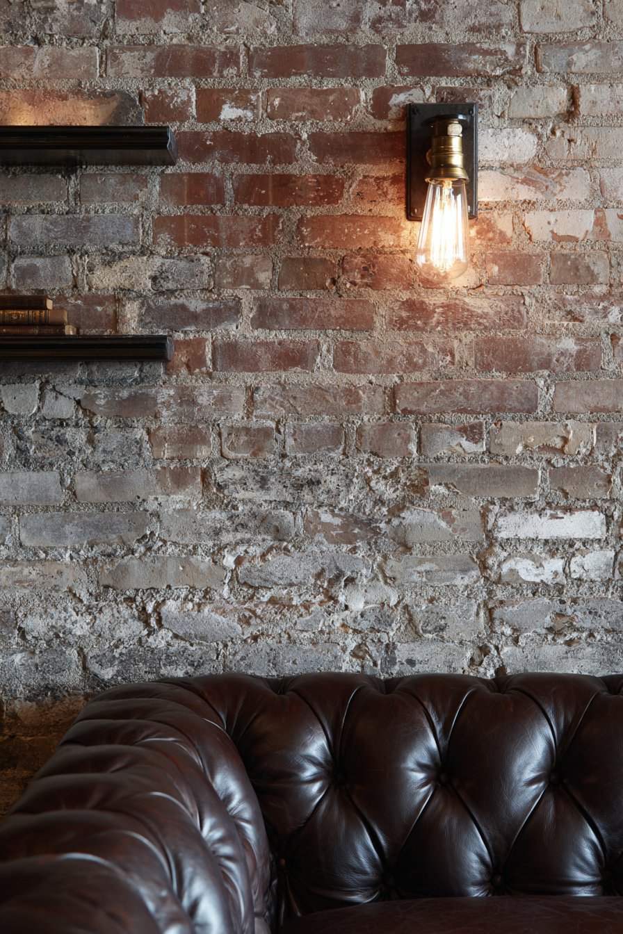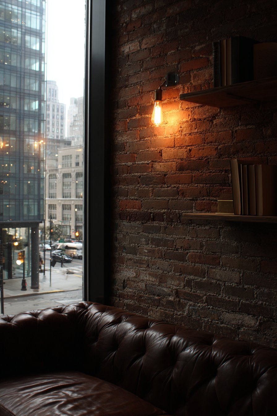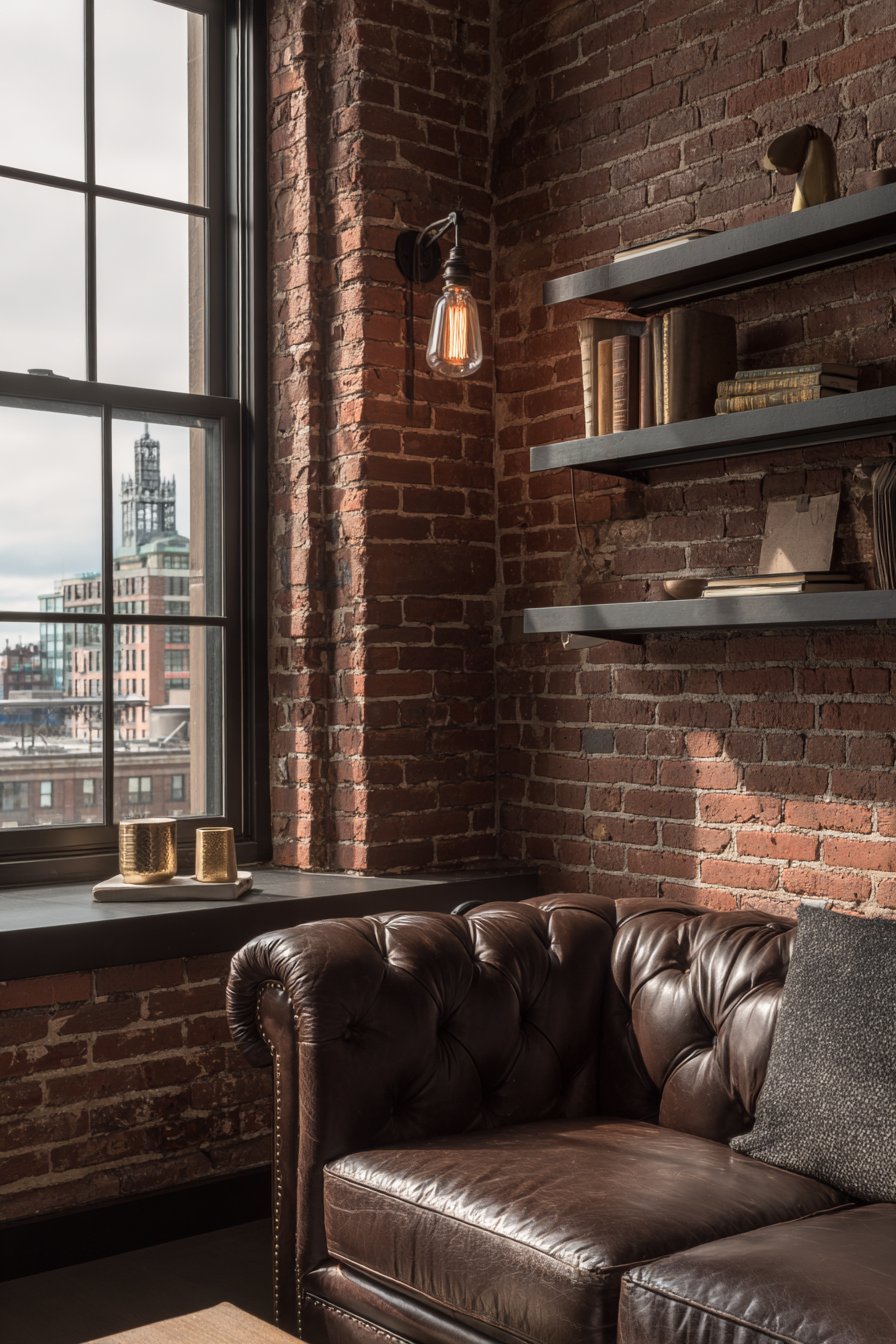 Edison bulbs in the sconces provide warm ambient glow. The vintage fixtures complement the brick’s age and character. Black metal floating shelves are installed asymmetrically. Leather-bound books and brass objects display thoughtfully.