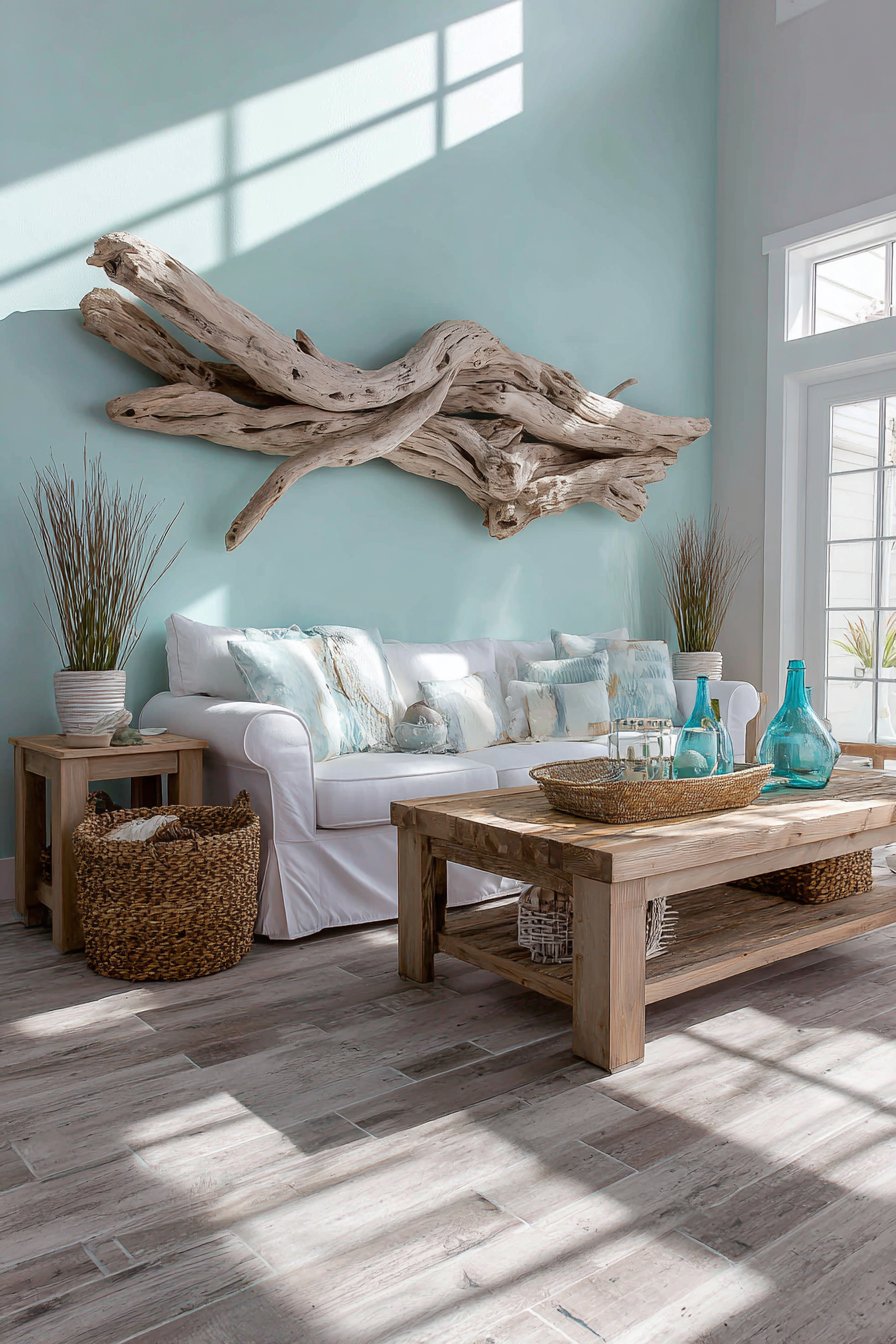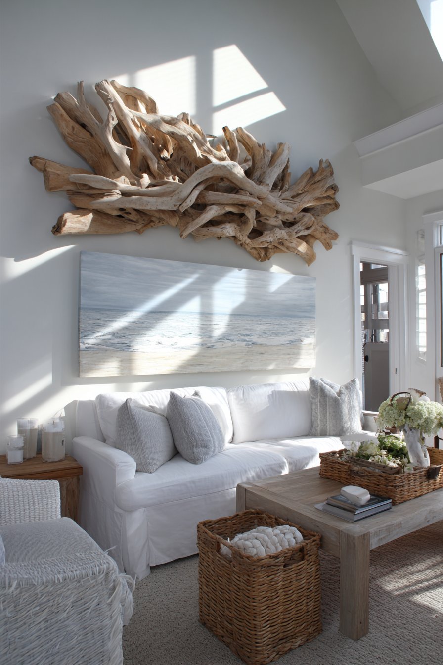 Coastal living embraces organic art through weathered driftwood sculpture. The six-foot piece mounts horizontally as focal artwork. Natural gray tones and curved forms bring beach memories indoors. The three-dimensional quality creates significant visual interest.