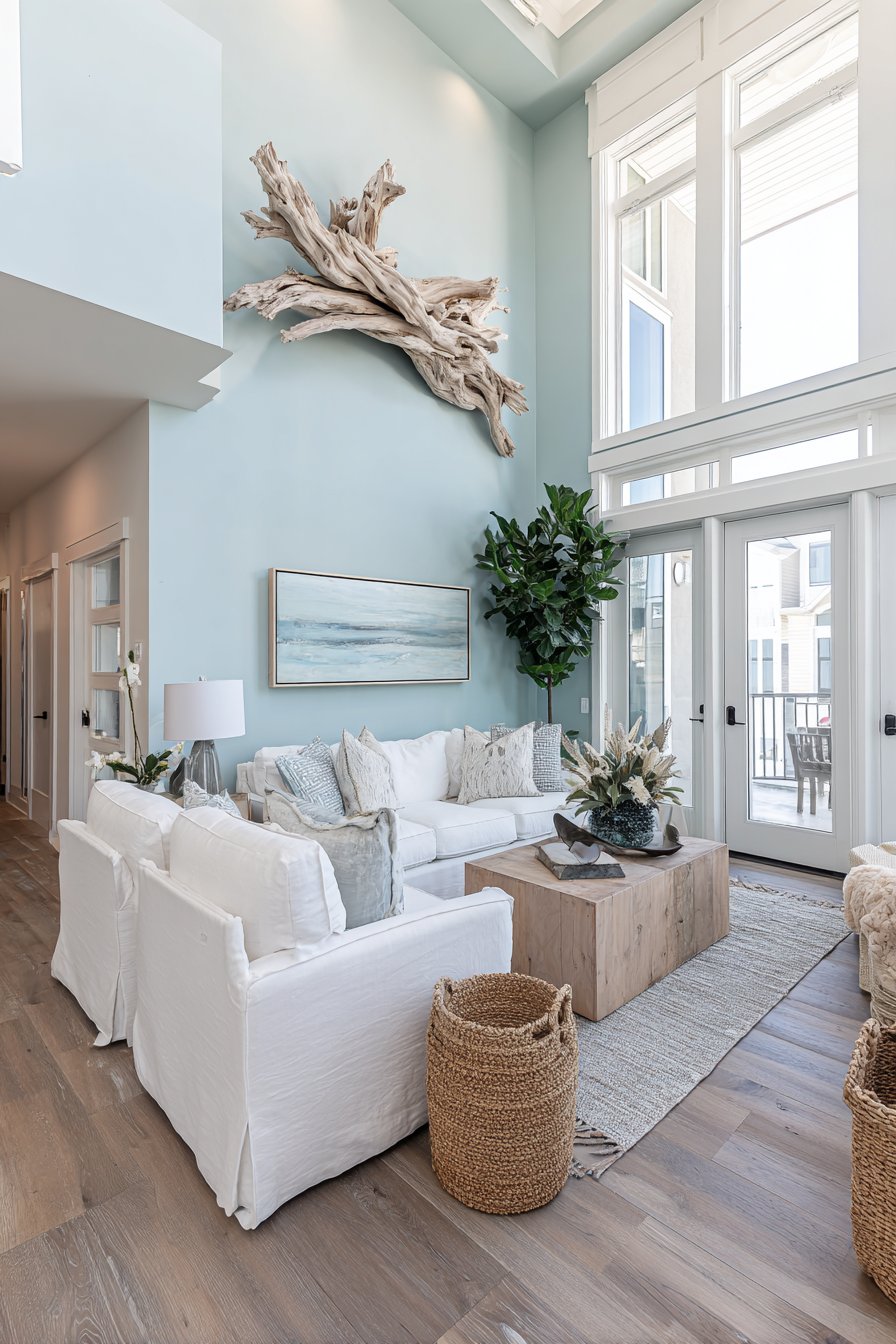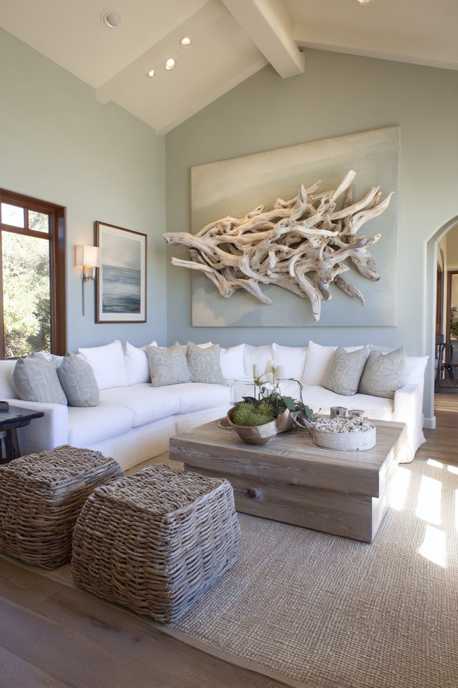 Seagrass baskets introduce additional natural fiber texture. Linen textiles add soft tactile variety throughout. These materials create layered coastal comfort. The space feels relaxed without appearing themed or contrived.