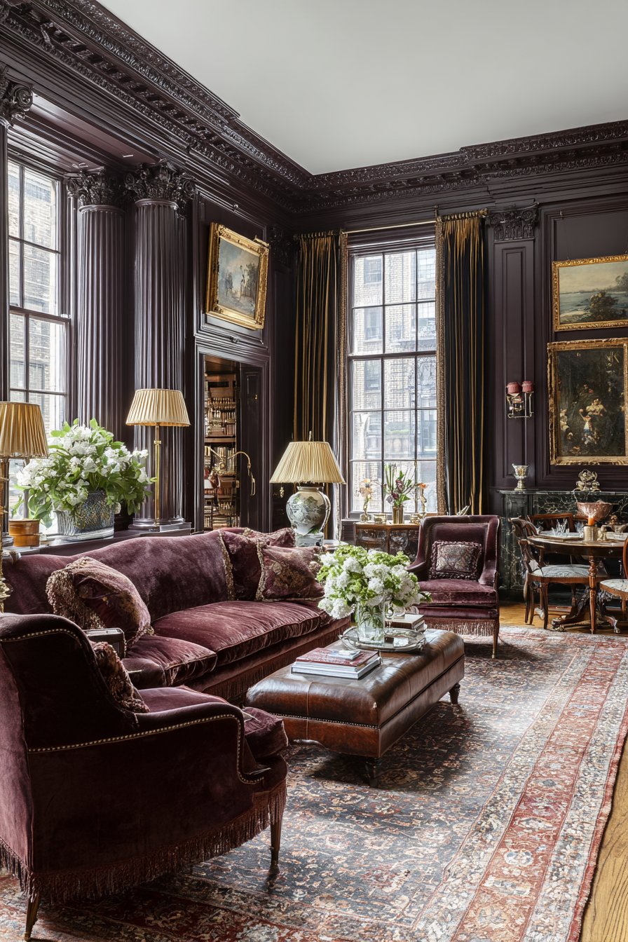 Crown molding and wainscoting provide architectural detail throughout. These traditional elements frame the wall art beautifully. A burgundy velvet sofa establishes the formal aesthetic. Oriental rug patterns add rich color and texture underfoot.