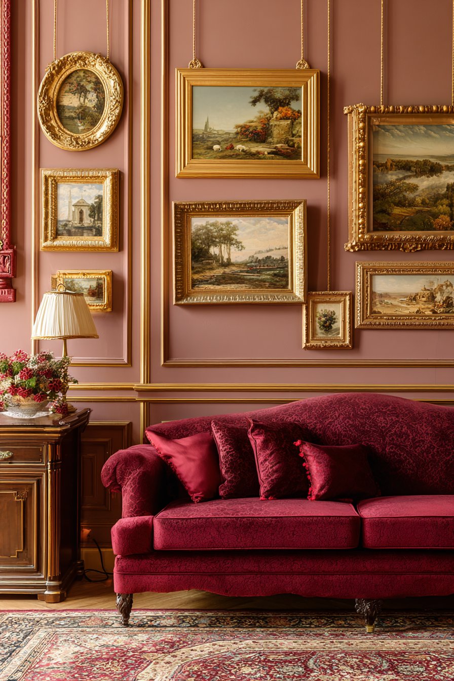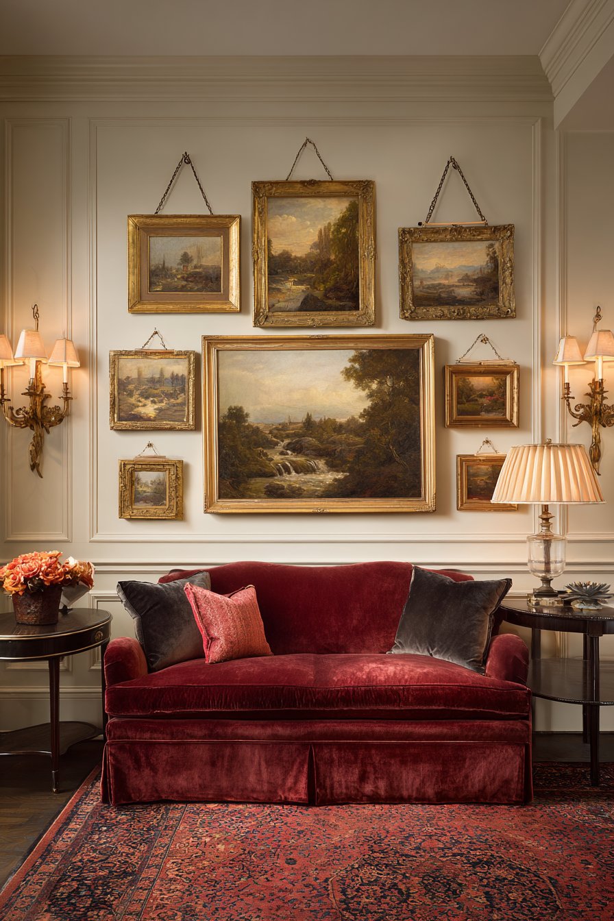 Classic elegance manifests through picture rail molding display. Multiple oil paintings hang from brass chains and hooks. Ornate gold frames contain landscapes and still life paintings. The layered salon-style arrangement creates sophisticated drama.