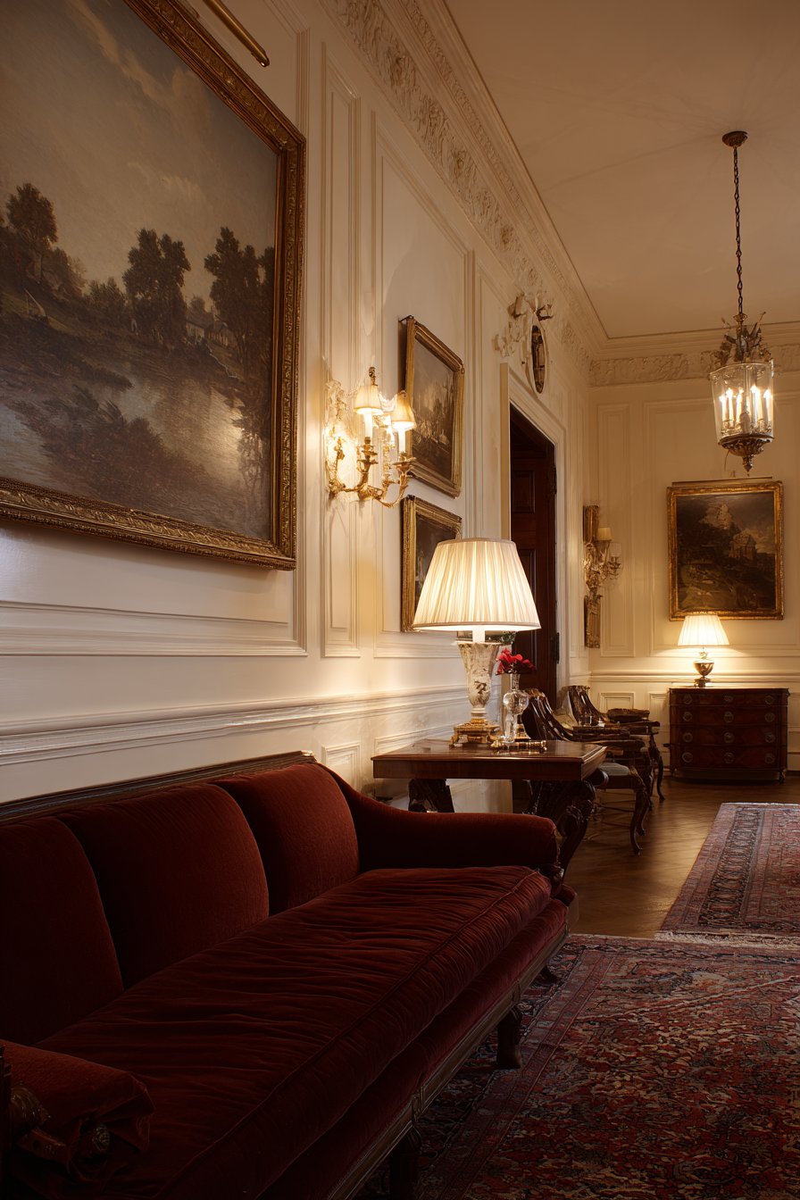 Warm ambient lighting from table lamps creates gallery illumination. The soft glow prevents harsh reflections on painting surfaces. Evening lighting transforms the space into an intimate salon. This traditional approach suits formal entertaining spaces perfectly.