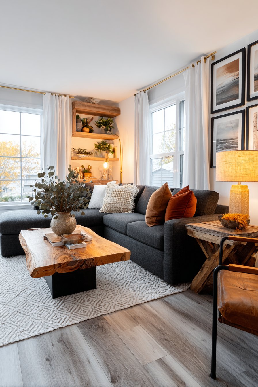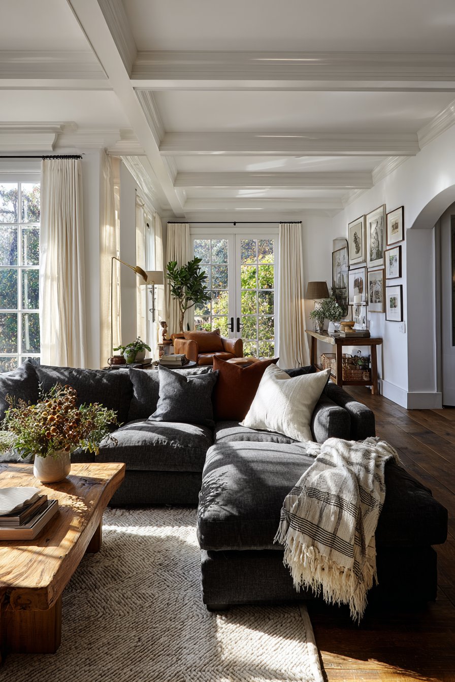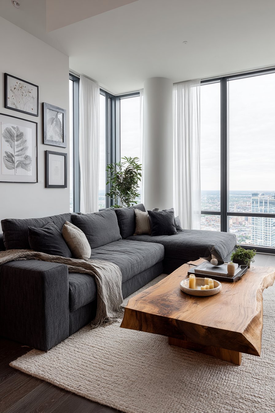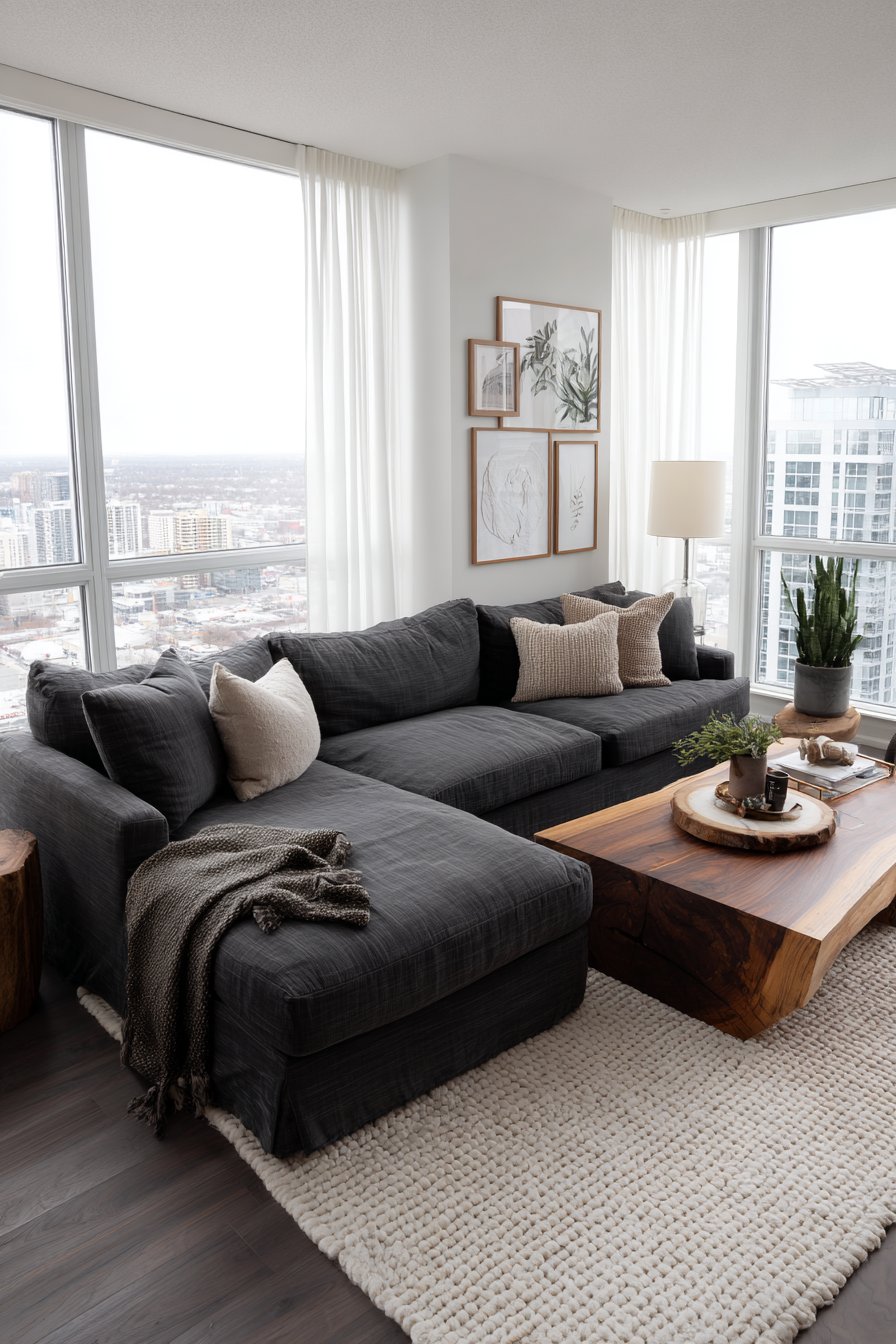 This sophisticated living room centers around a plush charcoal grey sectional sofa. Deep cushions provide exceptional comfort for extended lounging. The linen upholstery offers durability with refined texture. A natural oak coffee table with live edge detail anchors the seating arrangement. The organic wood edge celebrates nature’s imperfect beauty.