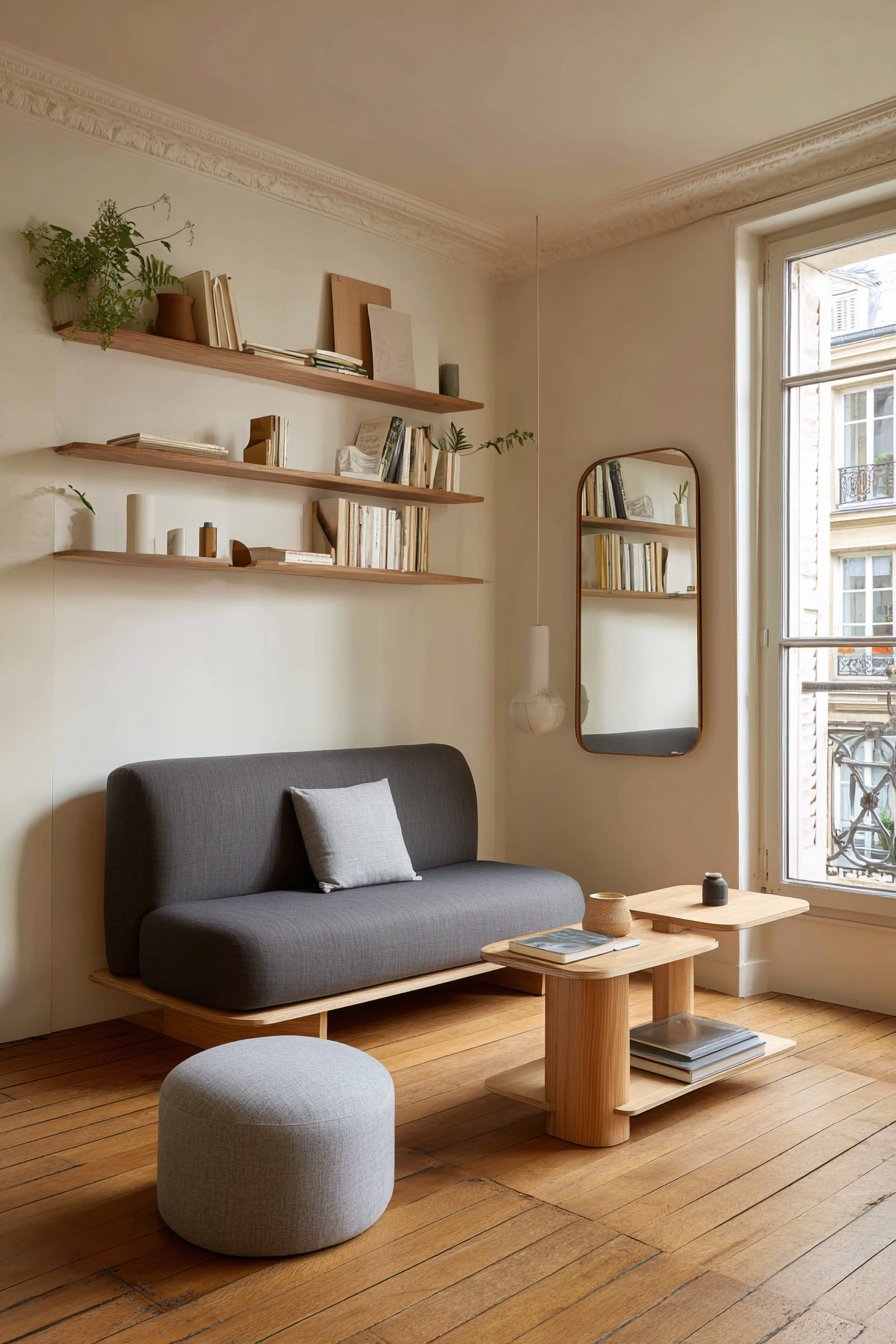 Floating wall-mounted shelves in alternating lengths display books and plants. The vertical arrangement conserves precious floor space. A large mirror with simple frame leans against the wall. The reflection enhances perceived room size significantly. A multi-functional ottoman with hidden storage serves as extra seating.