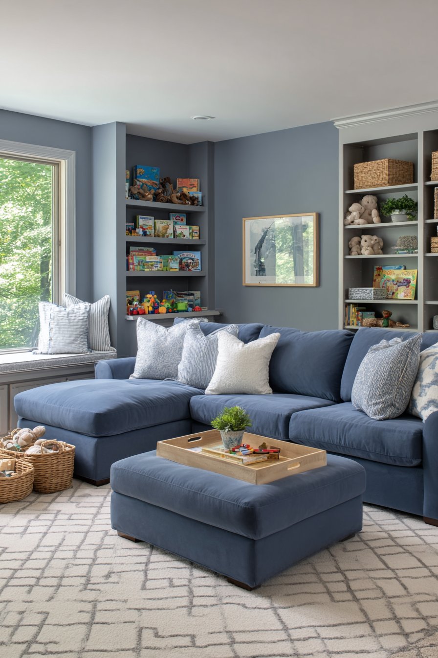 Soft furniture corners and secured bookshelves demonstrate safety considerations. Natural afternoon light creates warm, inviting atmosphere. This design proves that family-friendly spaces can maintain sophisticated aesthetics. Practical solutions integrate seamlessly into beautiful design. Active households benefit from thoughtful planning and durable materials.