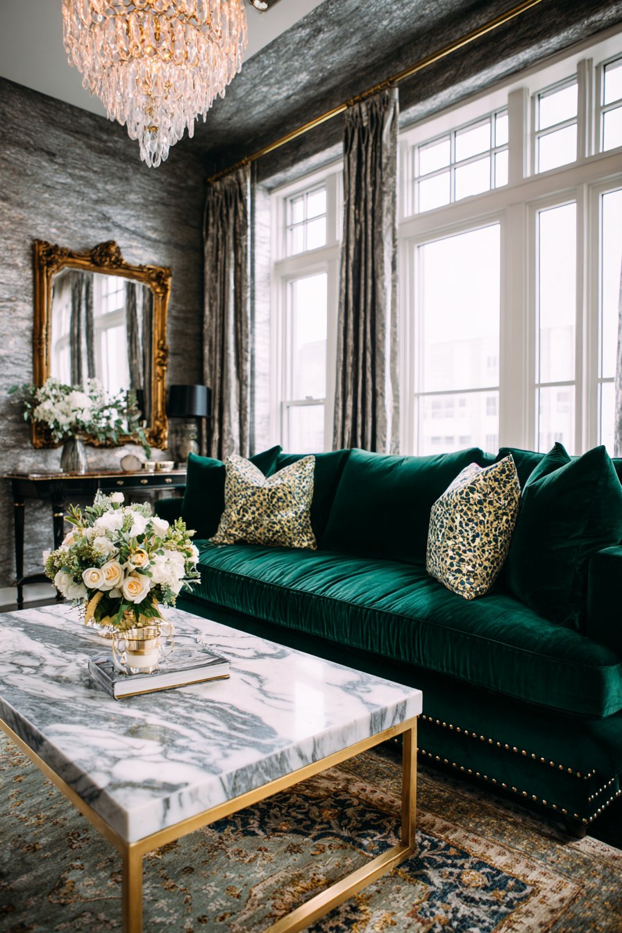 Luxe design celebrates premium materials and refined craftsmanship. A velvet sofa in rich emerald green features brass nail head trim. Down-filled cushions provide exceptional comfort and quality. A marble coffee table with gold-veined Calacatta marble makes dramatic statement. The luxury stone elevates the entire space.