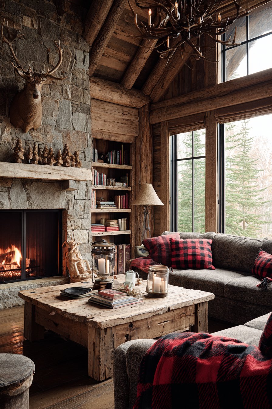 A reclaimed barn wood coffee table with iron hardware shows authentic wear. The weathered surface tells stories of previous life. Wool plaid throw blankets in red and black drape over furniture. An antler chandelier and wrought iron wall sconces provide ambient lighting. Wide plank pine flooring displays natural variations and knots.