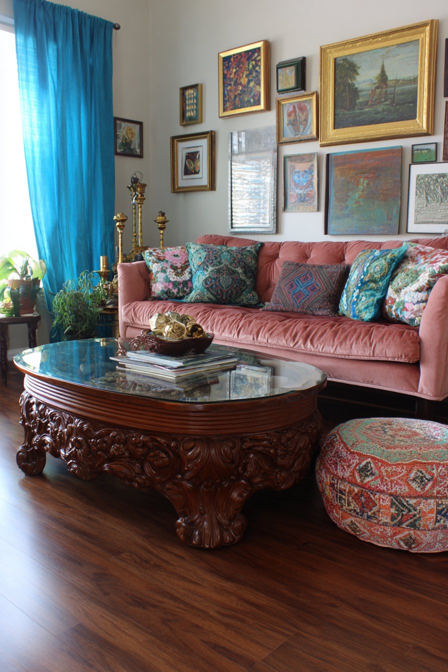 Eclectic maximalist design celebrates abundance and personal collection. A vintage velvet sofa in dusty rose anchors the space. Multiple patterned throw pillows mix florals, geometrics, and global prints. The confident pattern mixing creates visual richness. An ornate carved wood coffee table with glass top displays art books.