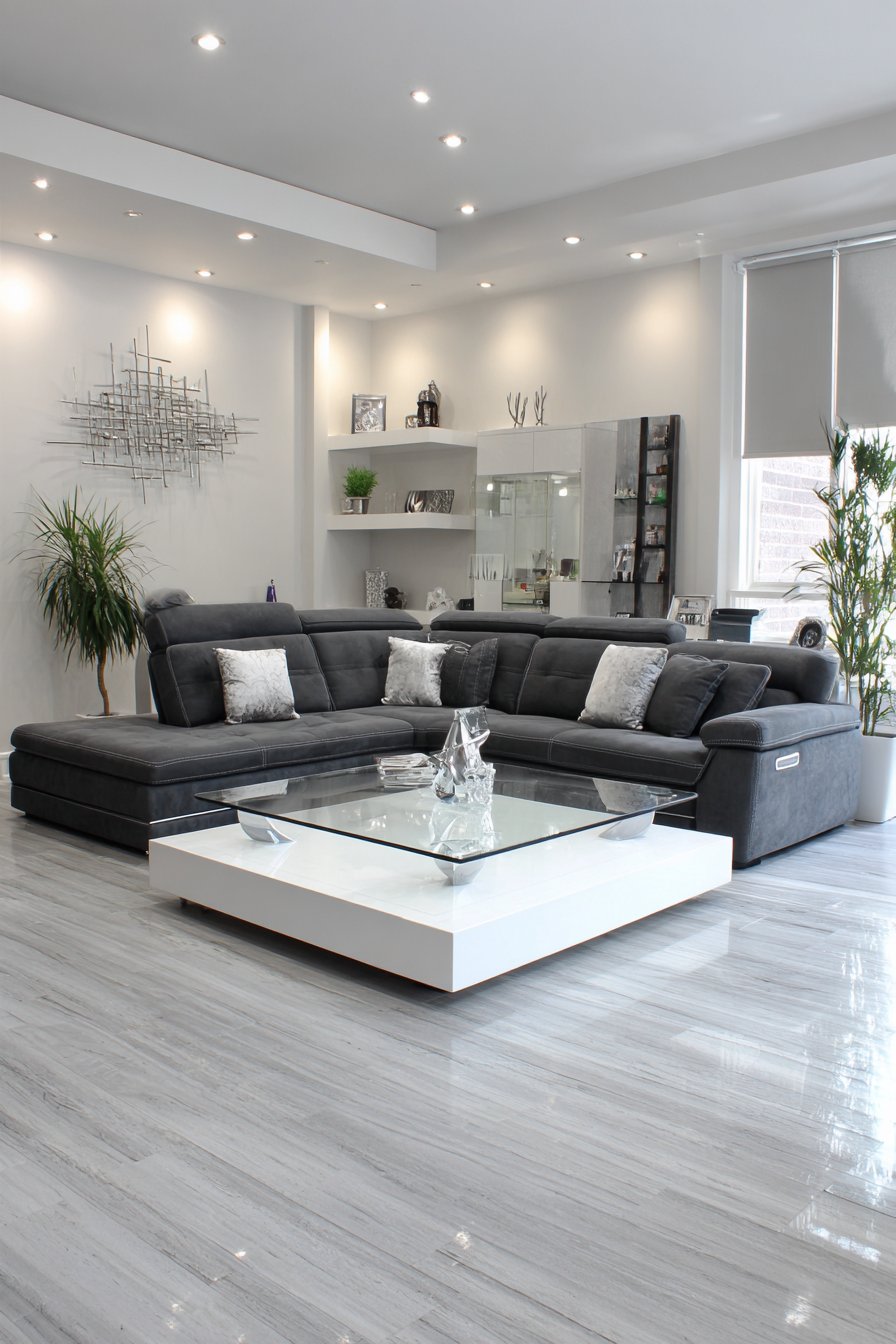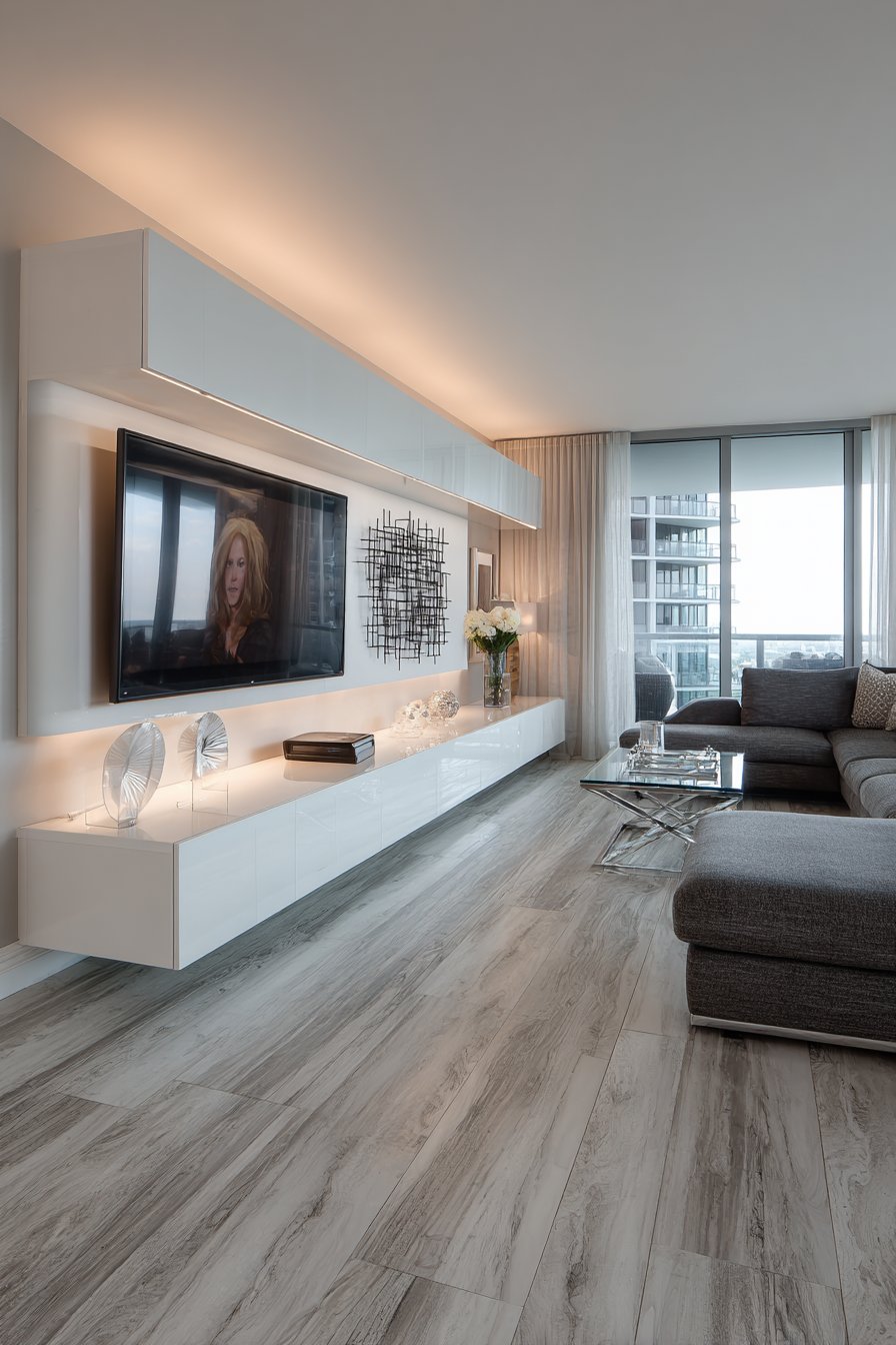 Contemporary design emphasizes clean lines and integrated technology. A floating media console in high-gloss white features integrated LED lighting. Cable management systems maintain clean appearance. A modular sectional sofa in charcoal grey includes adjustable headrests. USB charging ports integrate into furniture for modern convenience.