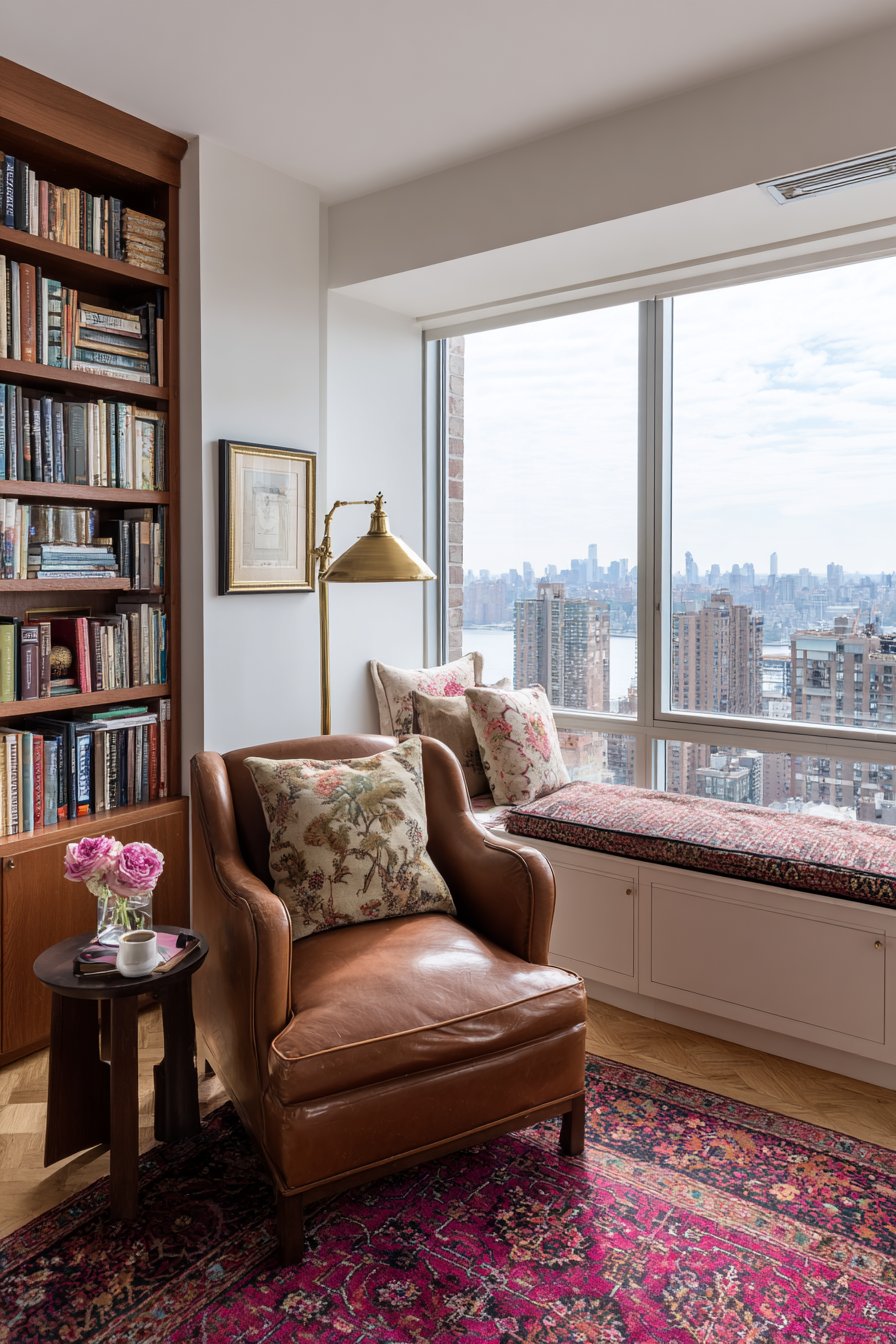 A small walnut side table holds reading essentials. Vintage Persian runner rug adds warmth and pattern. A large window with cushioned seat built into alcove offers an alternative reading spot. Throw pillows in faded florals add soft comfort. Natural afternoon light perfect for reading fills the space.
