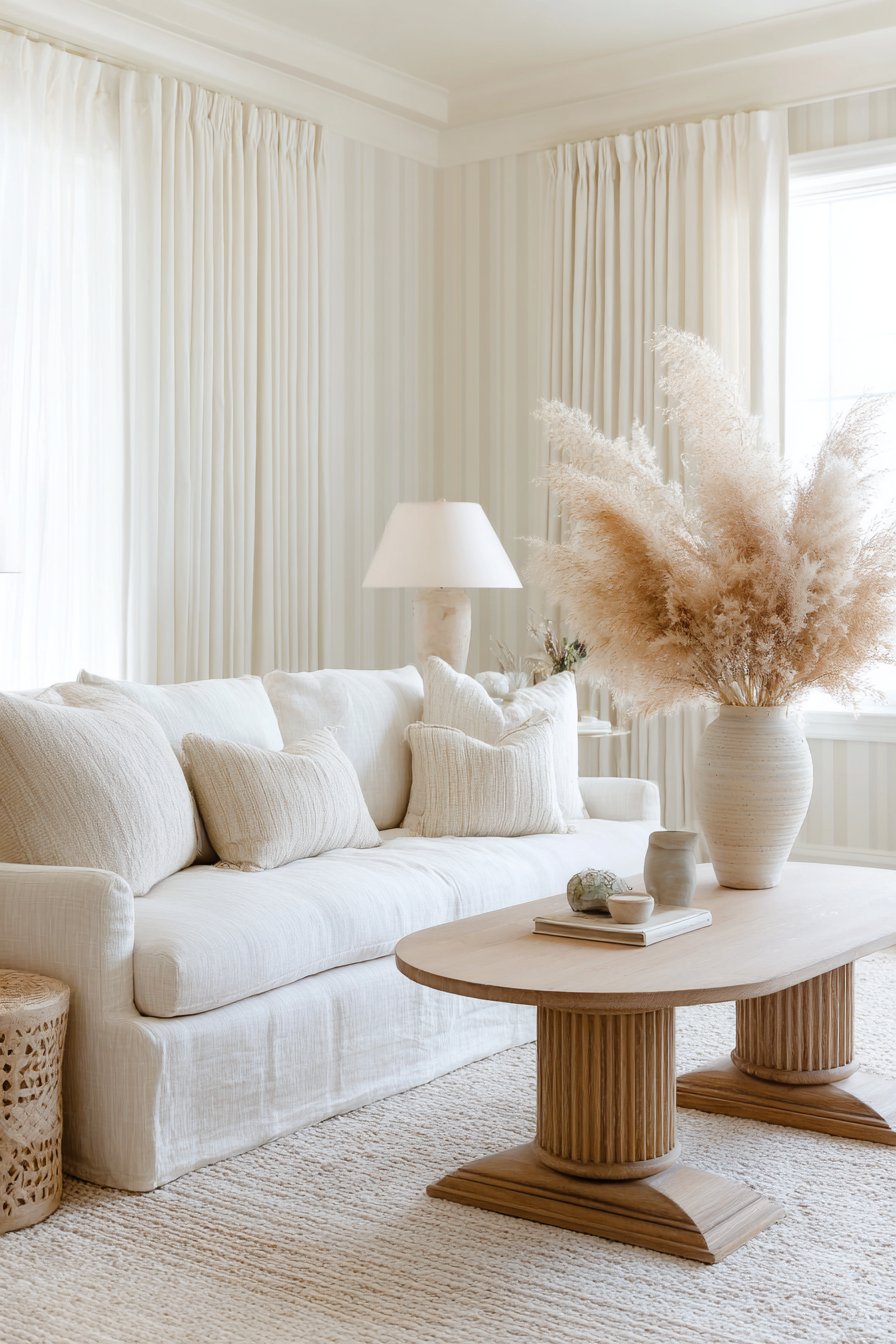 Natural fiber curtains in unbleached linen filter soft light. A wool area rug in oatmeal with subtle stripe detail grounds the space. Ceramic table lamps with linen shades maintain tonal consistency. Dried pampas grass in oversized floor vase adds organic element. Soft morning light through sheer curtains creates ethereal quality.