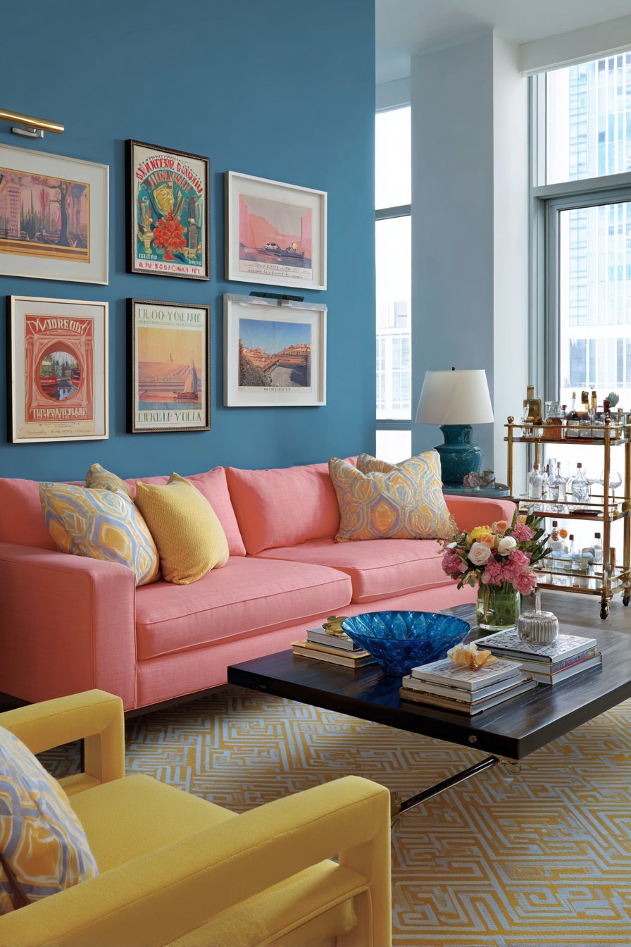Colorful design brings energy and personality to living spaces. A sofa upholstered in vibrant coral fabric makes bold statement. Accent chairs in sunny yellow linen add additional color impact. A gallery wall displays vintage travel posters in coordinating frames. The colorful graphics enhance the energetic atmosphere.