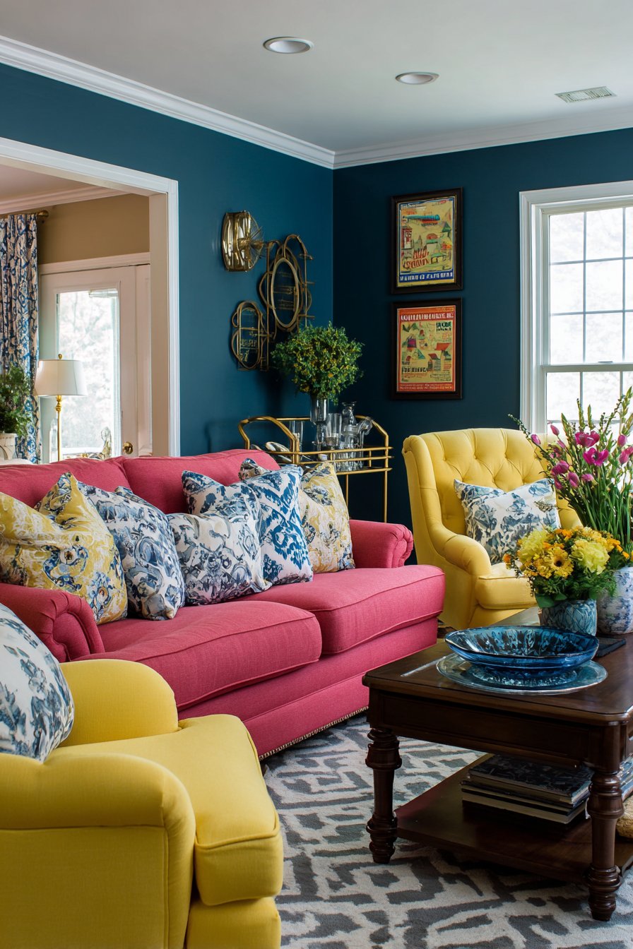 A painted accent wall in deep teal provides bold backdrop. The coffee table styled with art books and cobalt blue bowl. Fresh flowers add natural color variation. A geometric patterned rug incorporates all room colors. The unified palette creates cohesion despite bold choices. A brass bar cart with glassware adds functional glamour.