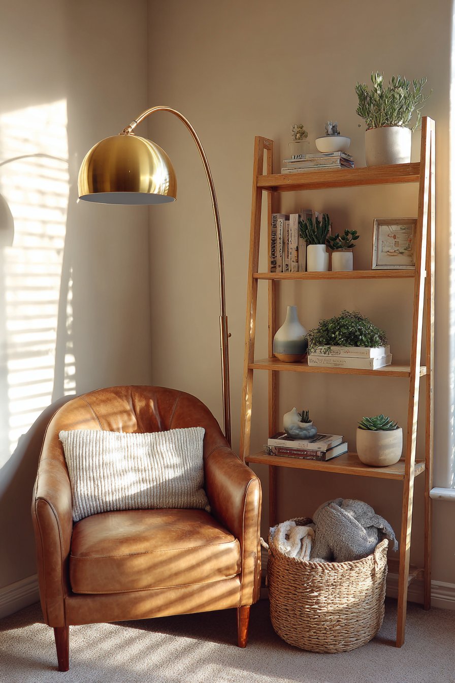 Warm afternoon light creates subtle shadows across the leather. These shadows emphasize the lived-in quality that makes spaces feel authentic. The corner arrangement maximizes the underutilized space effectively. Every element serves both practical and aesthetic purposes. This design proves that small zones create significant impact.