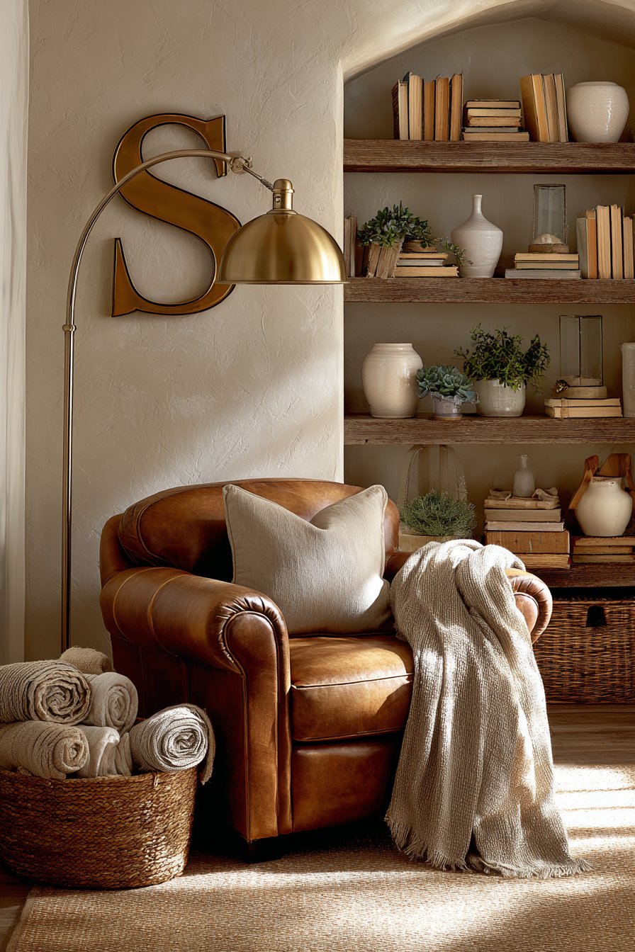A vintage leather armchair in cognac brown creates an intimate reading corner. The aged leather develops rich patina over time. A tall arc floor lamp with brass finish provides focused task lighting. The adjustable arm positions light exactly where needed. This functional element doubles as sculptural art.