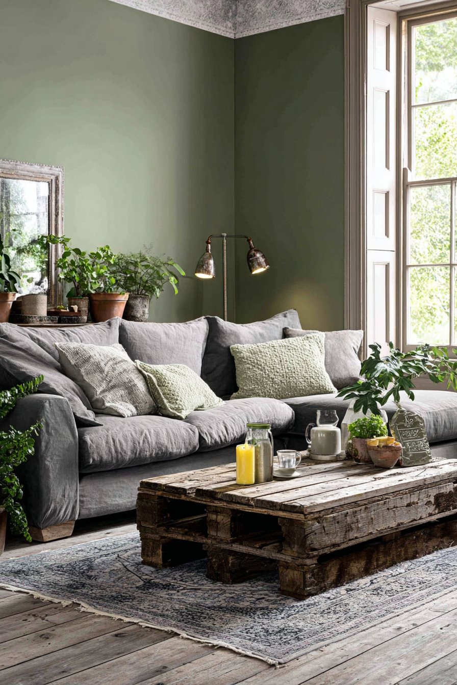 Walls painted with zero-VOC paint in soft sage promote indoor air quality. Window treatments in organic linen avoid synthetic materials. Potted plants in terracotta pots improve air quality naturally. Thrifted brass lamps refurbished with LED bulbs combine vintage style with energy efficiency. Natural light maximized through strategic mirror placement.