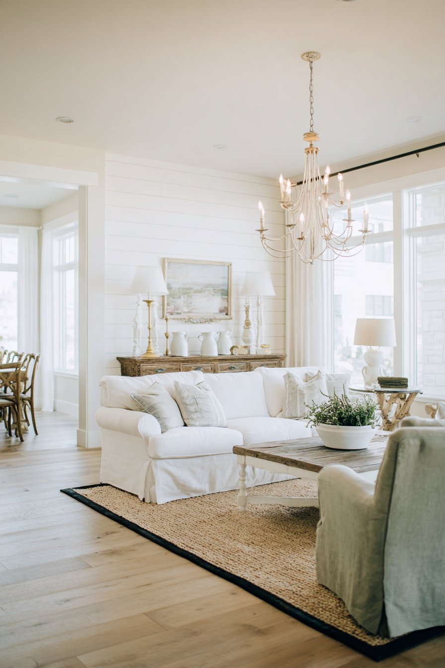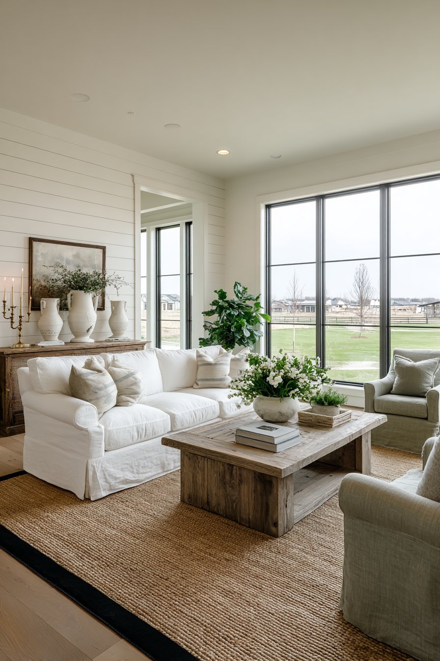 A reclaimed wood console table behind the sofa adds character. Vintage brass candlesticks provide vertical interest and warm metallic accents. A collection of white ceramic pitchers displays farmhouse simplicity. The shiplap accent wall painted in warm white adds textural dimension. This architectural detail references agricultural building traditions.