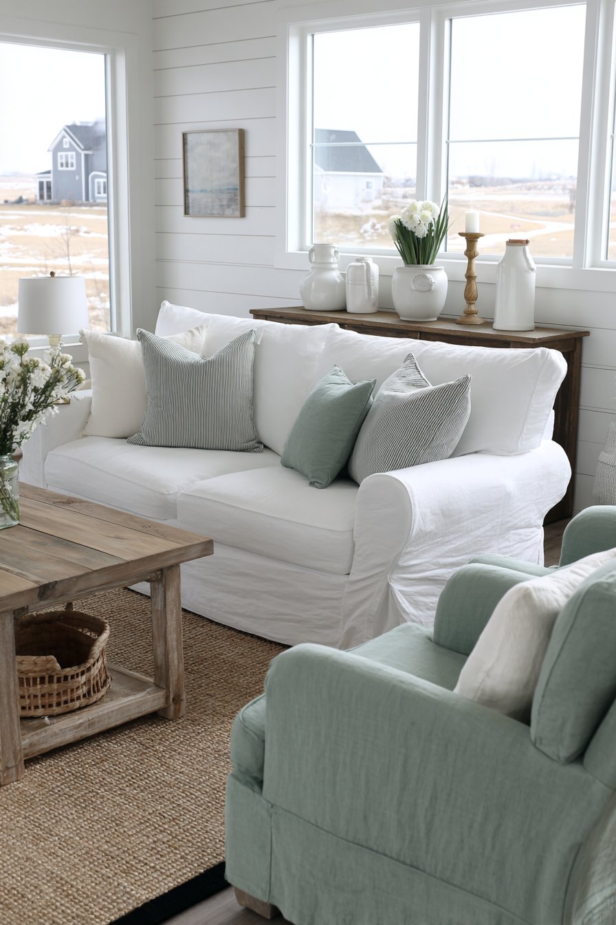 The modern farmhouse aesthetic combines contemporary comfort with rustic charm. A white slipcovered sofa with rolled arms provides timeless appeal. Two upholstered accent chairs in soft sage green linen flank the sofa. The symmetrical arrangement creates formal balance with casual materials. Slipcovered furniture offers practical washability for family living.