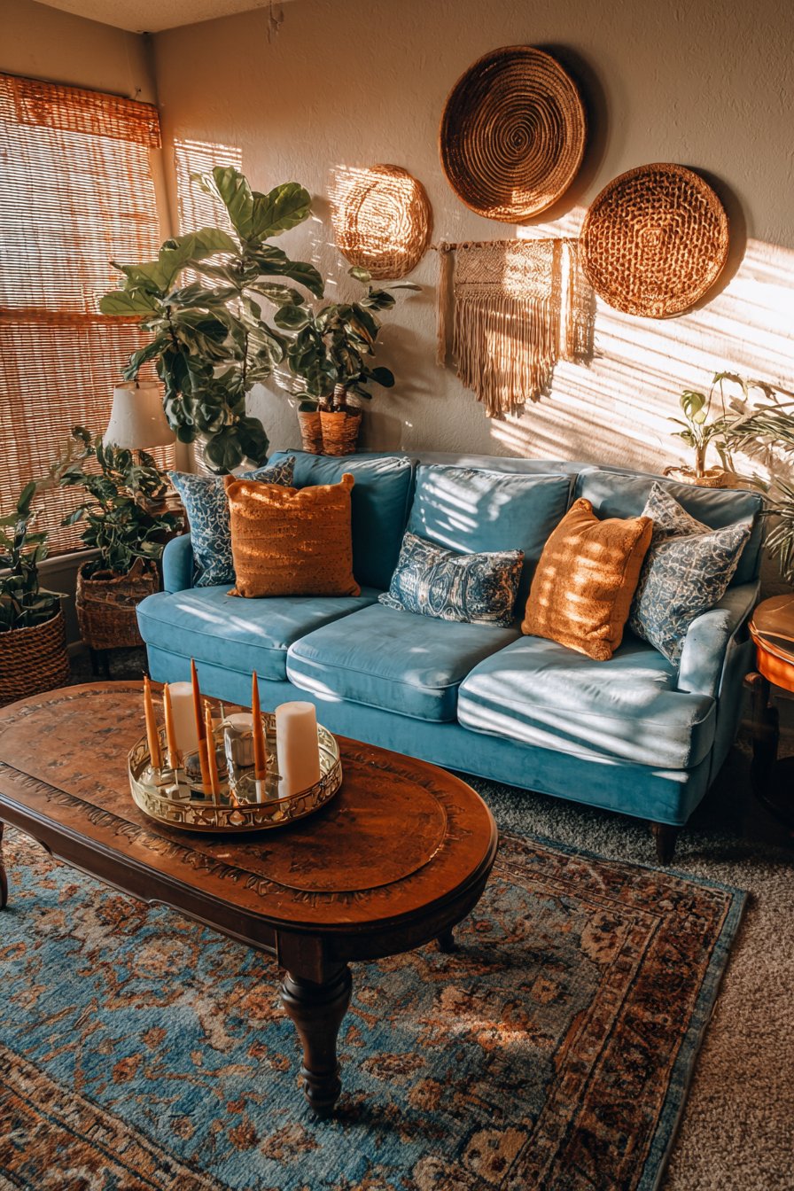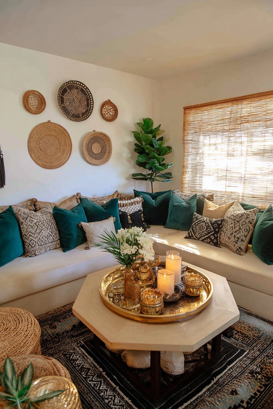 This bohemian-inspired living room celebrates color and pattern fearlessly. A low-profile sofa features jewel-toned velvet cushions in emerald and sapphire. Multiple patterned throw pillows layer florals, geometrics, and global prints. The abundant textile mix creates visual richness and comfort. Each pattern tells its own cultural story.