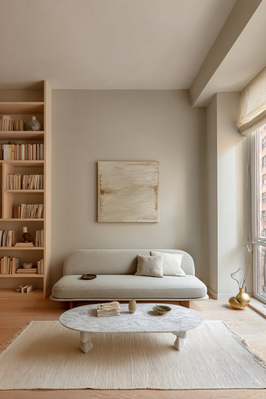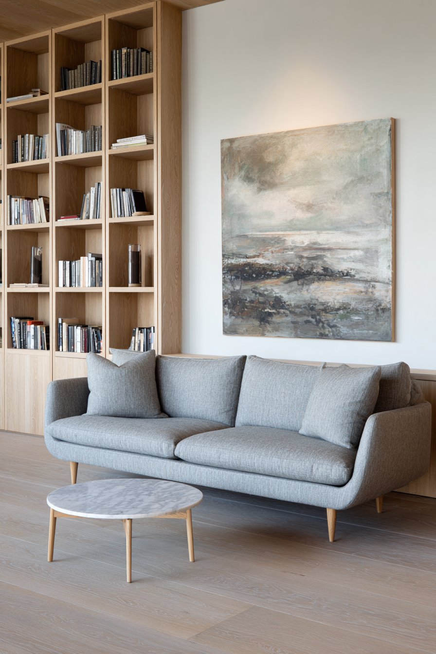 The wall showcases a single large-scale abstract painting. Muted earth tones complement the neutral color scheme. A floor-to-ceiling built-in bookshelf in light oak displays carefully arranged items. Books align precisely with minimal decorative objects. This intentional curation demonstrates “lagom” – the Swedish concept of just enough.