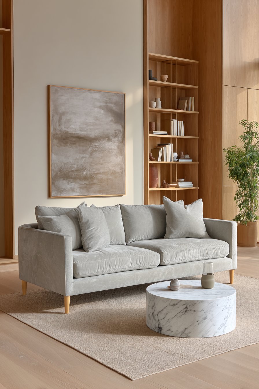 Minimalist Scandinavian design emphasizes functionality and simplicity. A streamlined grey sofa features tapered wooden legs. The clean-lined silhouette eliminates visual clutter. A simple round marble coffee table provides elegant surface space. The natural stone veining adds subtle organic pattern.