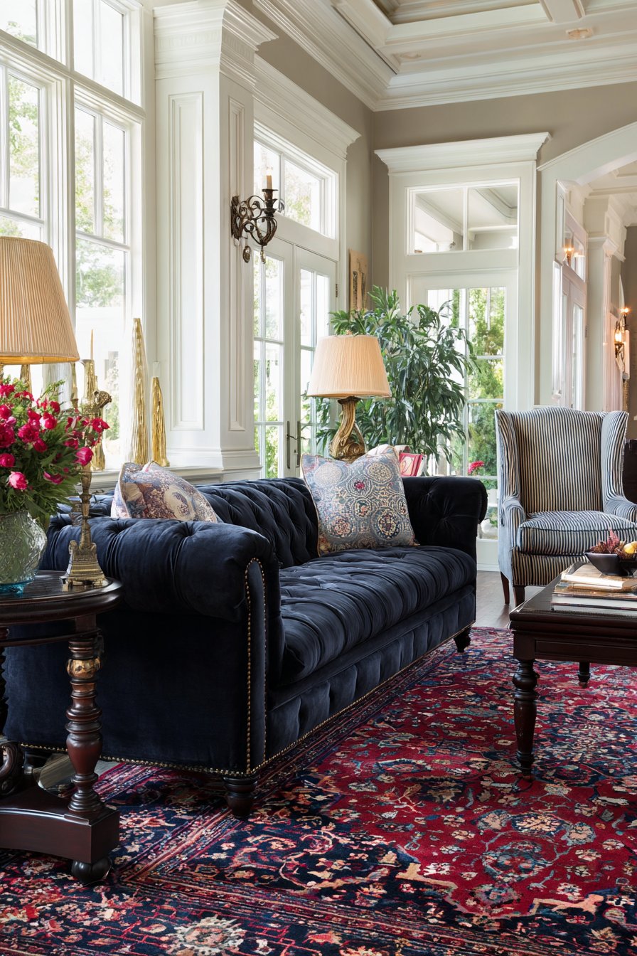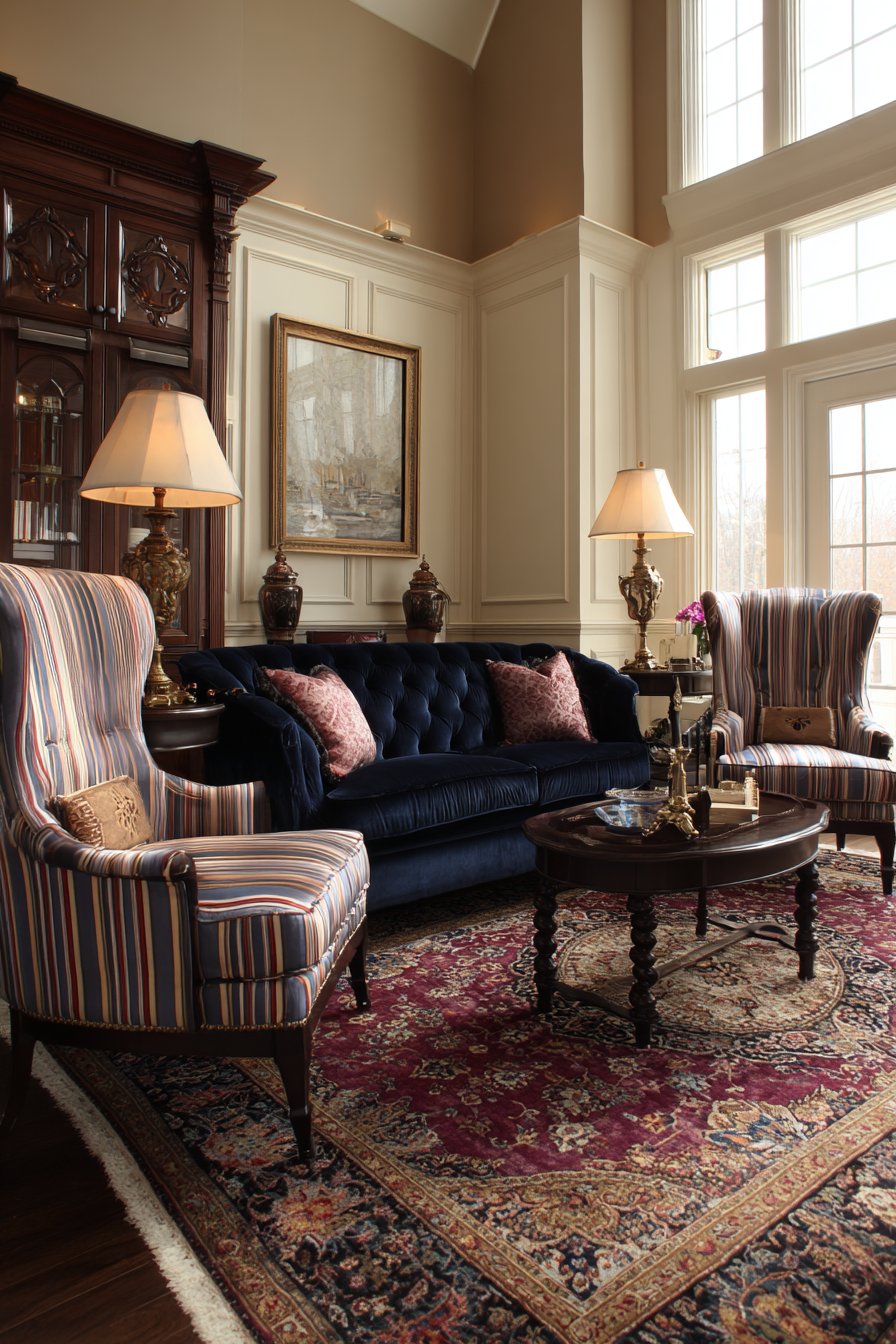Traditional design honors classical furniture forms and rich materials. A tufted Chesterfield sofa in deep navy velvet commands attention. The button tufting technique showcases upholstery craftsmanship. Two wingback chairs upholstered in cream and blue striped fabric provide additional seating. The formal arrangement encourages conversation and interaction.