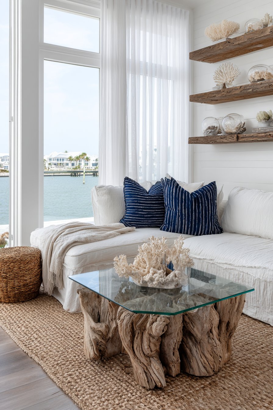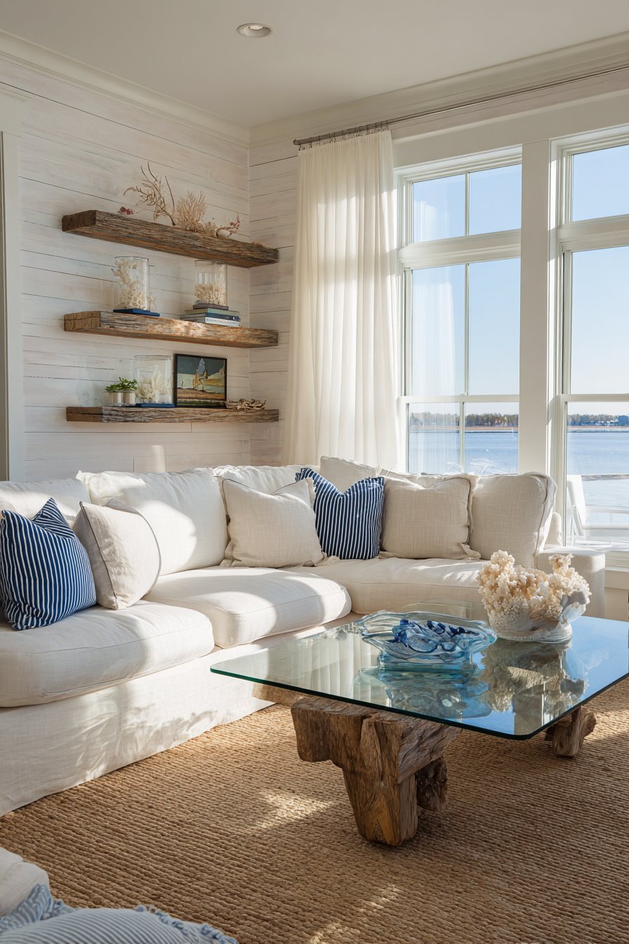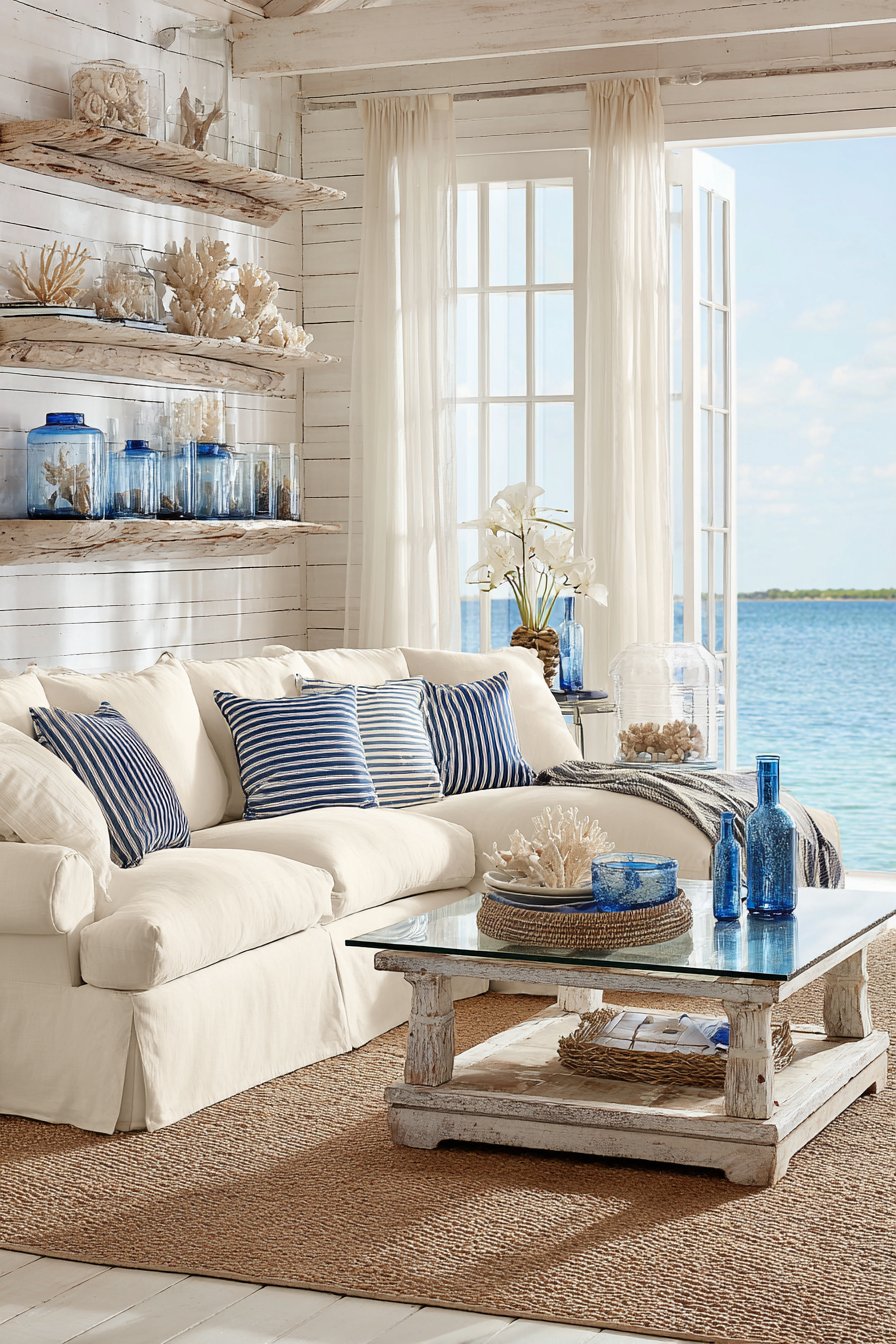 Navy and white striped throw pillows add nautical reference. The classic pattern evokes maritime tradition without cliché. Whitewashed shiplap walls provide subtle texture and light reflection. A collection of coral specimens and sea glass displays on floating shelves. These organic treasures celebrate coastal natural history.