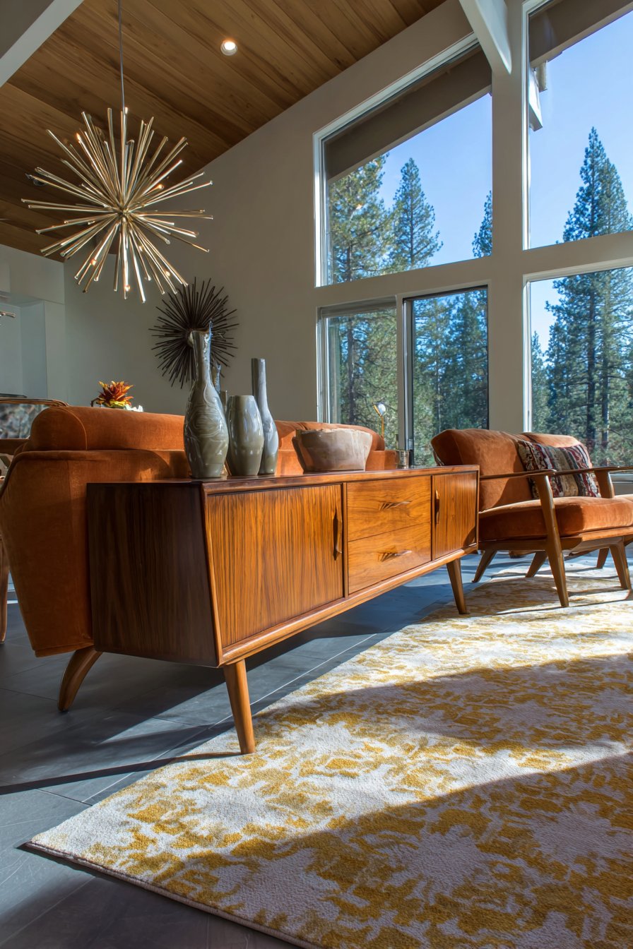 Large windows with minimal treatments flood the space with natural light. The open approach emphasizes connection to outdoors. This design requires authentic vintage pieces or quality reproductions. The warm wood tones create inviting atmosphere. Mid-century modern remains popular for its timeless functionality and optimistic aesthetics.