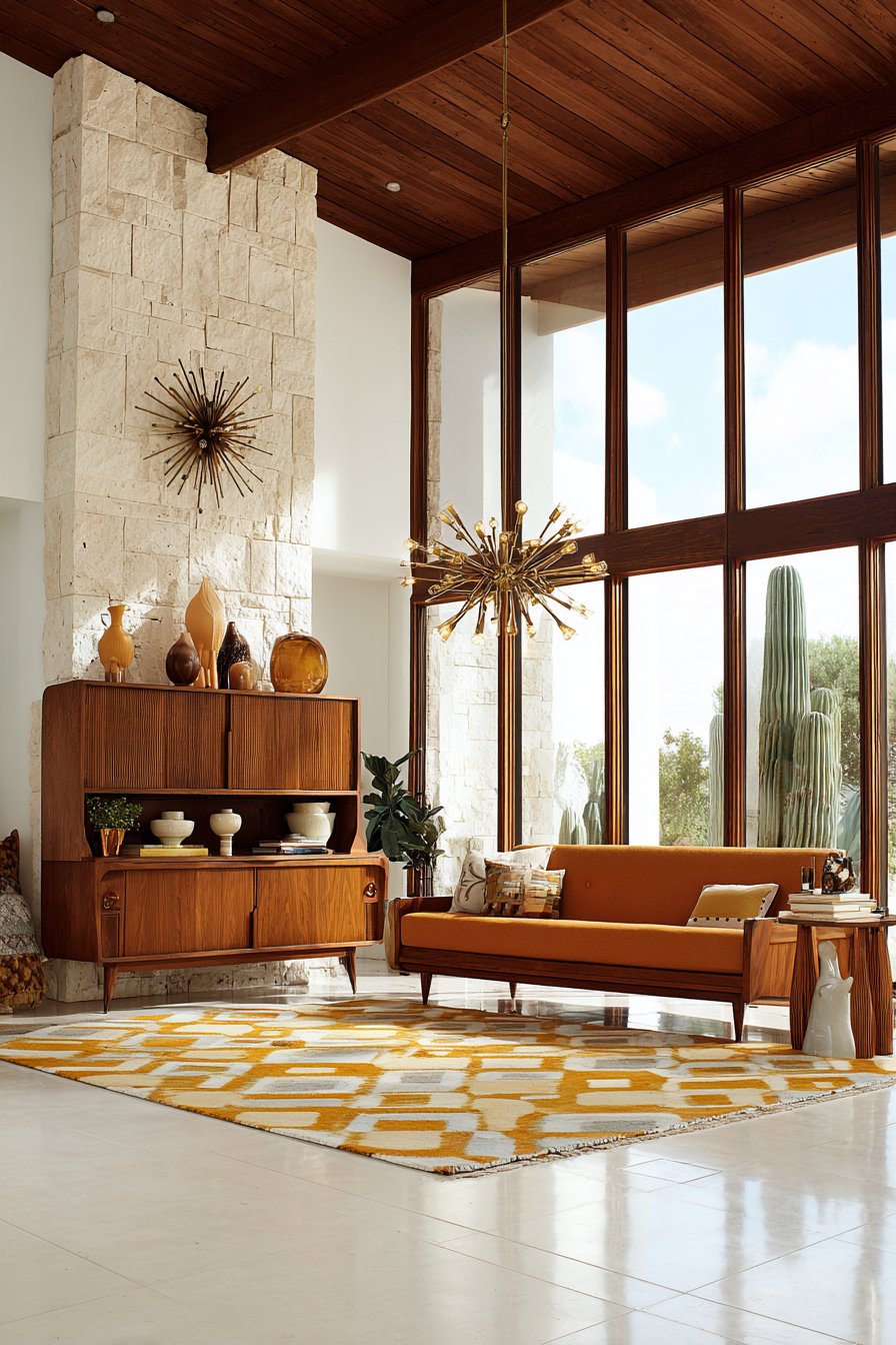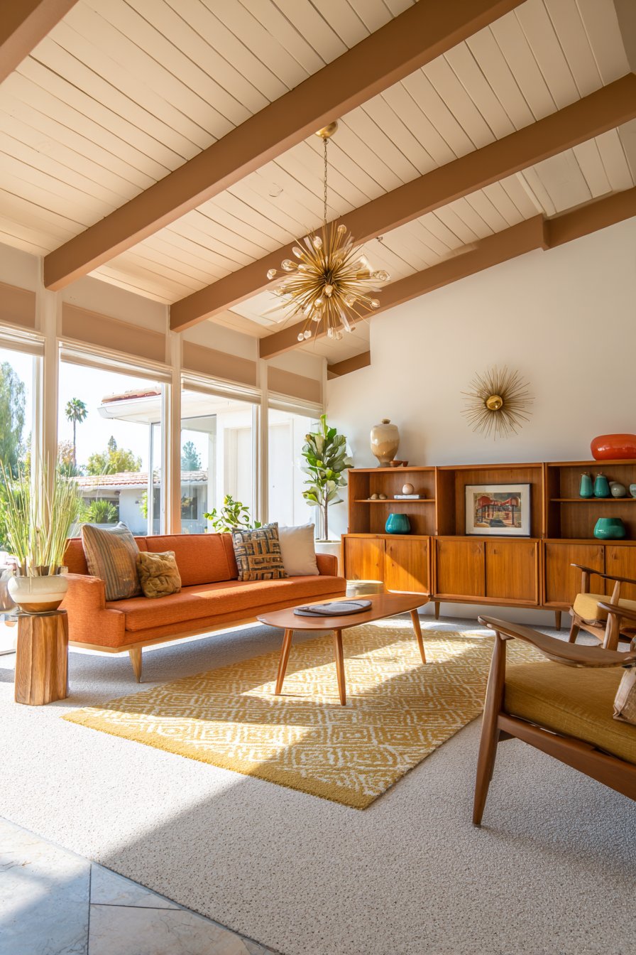 - Add period-specific accessories like starburst clocks and sputnik lighting