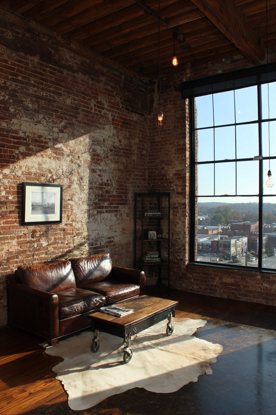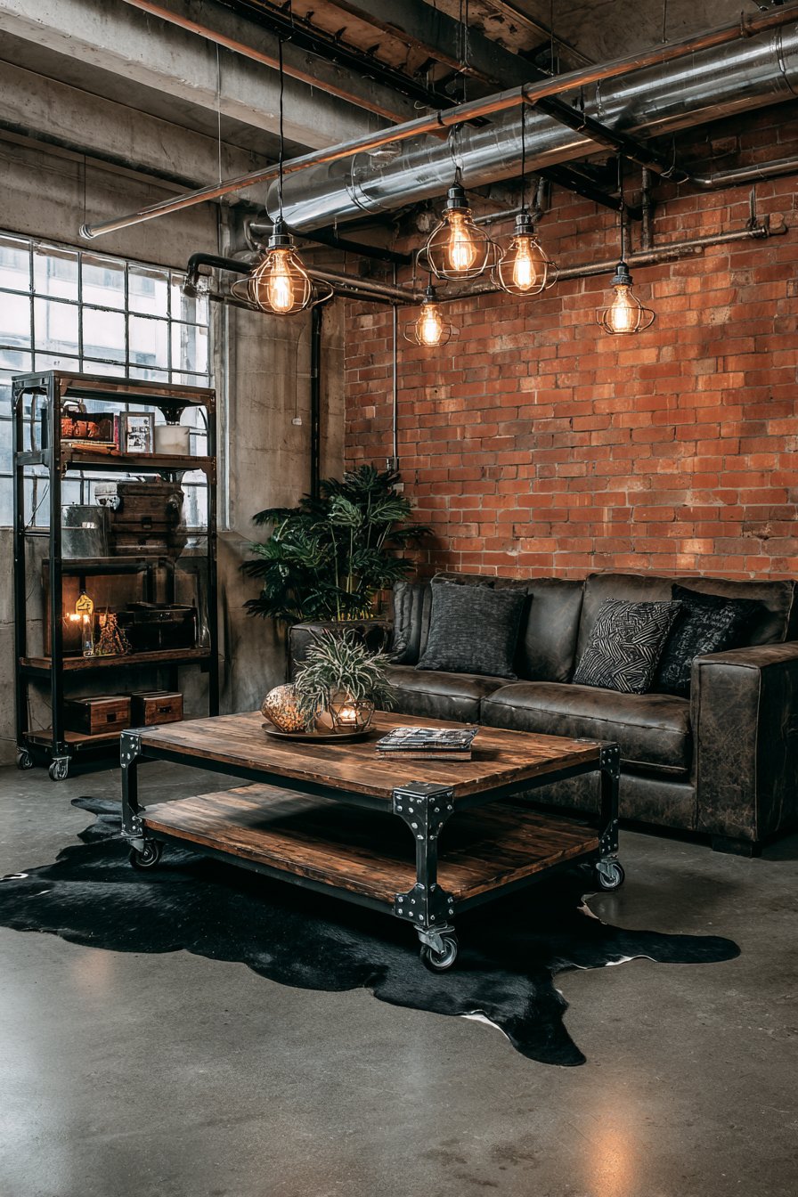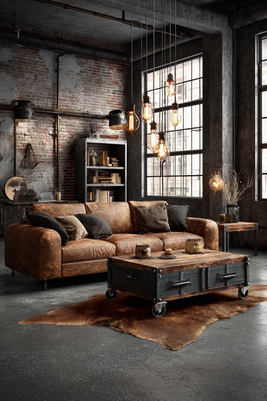 Industrial design celebrates raw materials and manufacturing aesthetics. An exposed brick wall provides textured backdrop. The distressed brown leather sofa develops character through use. A metal and wood coffee table with visible weld marks serves as centerpiece. Industrial casters add mobile functionality and visual interest.