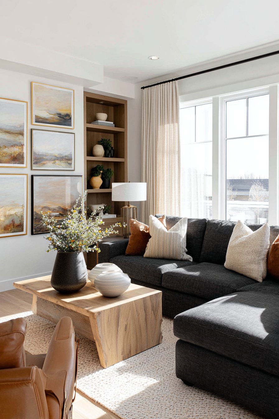 The gallery wall behind the sofa creates visual drama. Mixed frame styles combine matte black and natural wood finishes. Abstract art pieces alternate with botanical prints. This curated collection adds personality without overwhelming the space. The arrangement demonstrates how art elevates interior design beyond basic furniture placement.