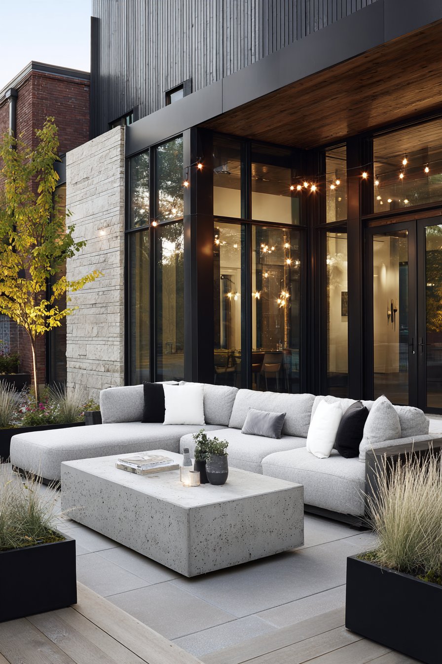 Contemporary outdoor furniture includes grey sectional sofa. Teak wood base adds warmth to modern aesthetic. Minimalist coffee table completes conversation area. Large porcelain pavers in light grey create foundation.