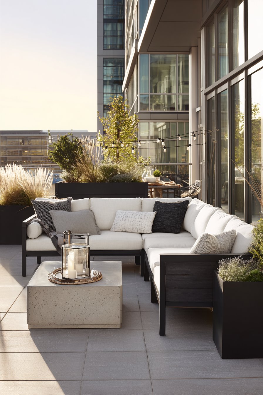 A spacious patio welcomes you with a generous L-shaped sectional. Charcoal performance fabric upholstery creates sophisticated visual appeal. Crisp white cushions provide striking contrast against the darker base. The low-profile design maintains clean horizontal lines throughout the space.