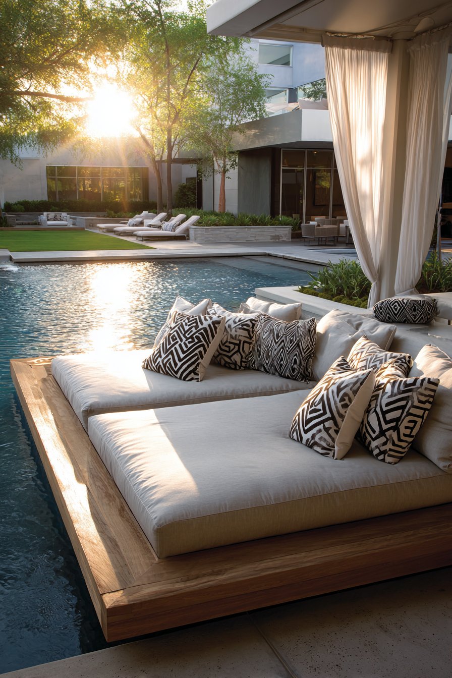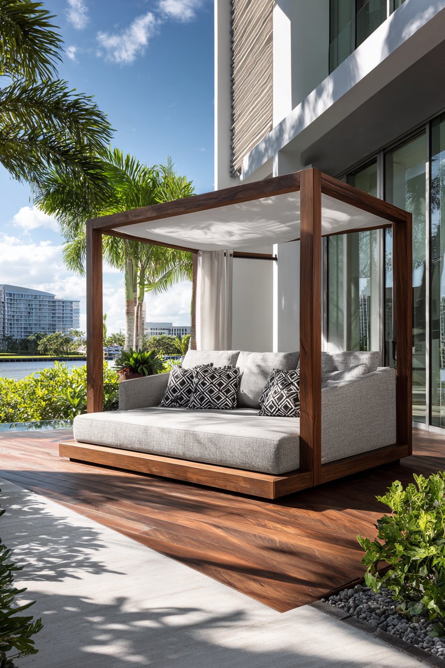 Afternoon sunlight highlights wood grain and fabric texture. Defined shadows emphasize the platform’s architectural quality. This luxury piece demonstrates multifunctional outdoor furniture. Storage capability maintains clean appearance while adding practicality.