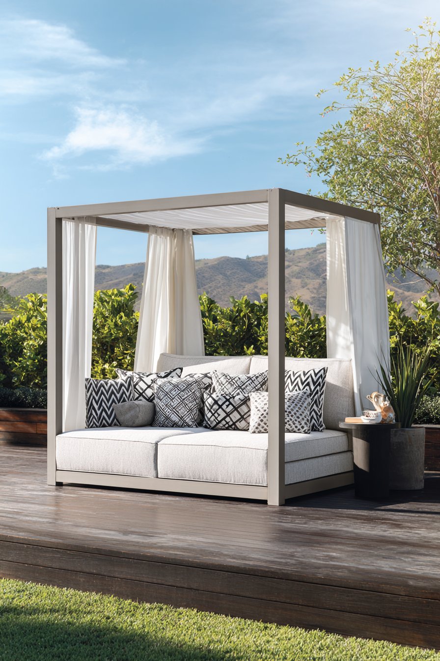 A daybed platform floats as separate deck element. Integrated storage hides beneath lift-up cushion sections. Performance fabric in neutral sand tone resists fading. Clean-lined framework in powder-coated aluminum ensures durability.