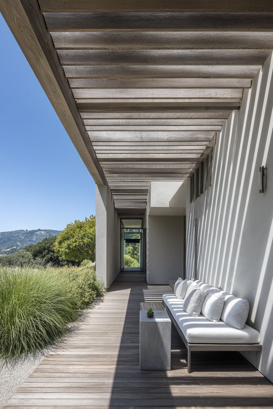 Contemporary garden wall features horizontal wood slat detailing. This provides an architectural backdrop for cushions. Ornamental grasses in galvanized metal planters soften hardscape. Natural afternoon light highlights fabric details.