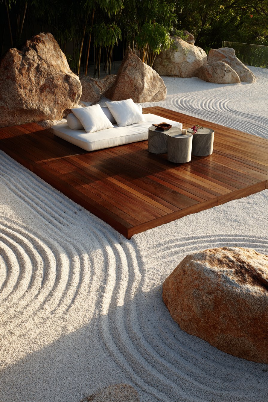 A single concrete side table offers surface without clutter. Surrounding landscape features raked white gravel. This zen garden style promotes contemplation and peace. Large statement boulders add sculptural elements naturally.
