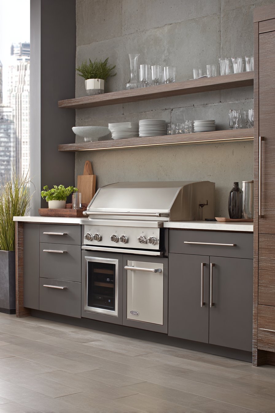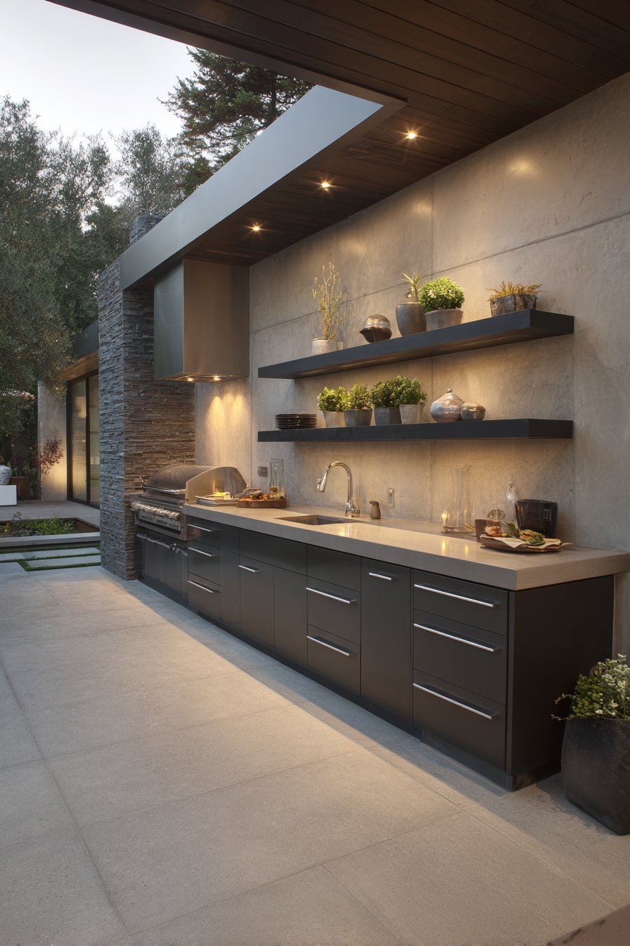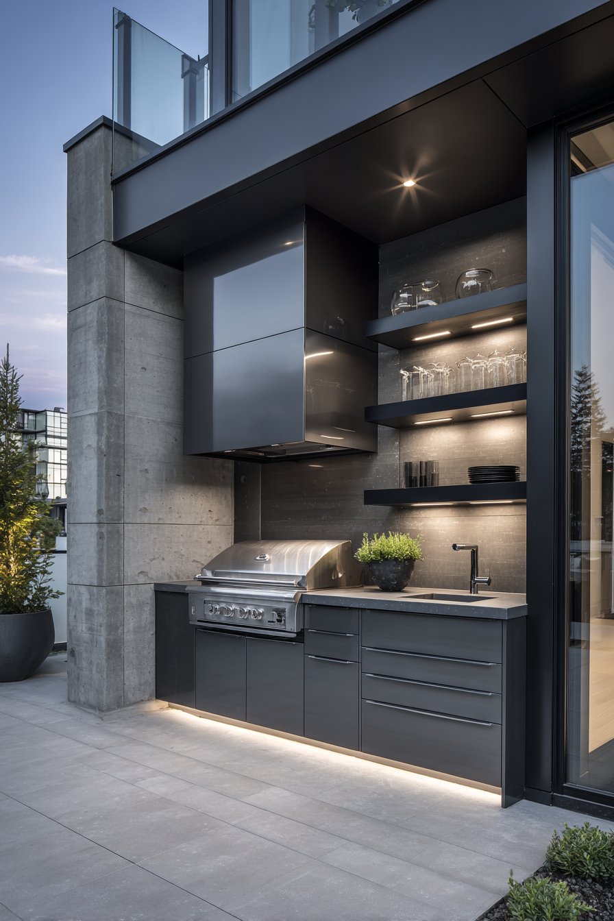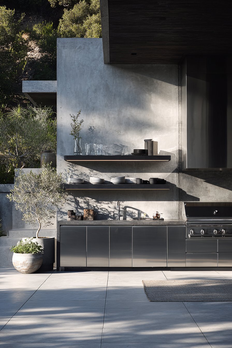 A professional-grade grill integrates into brushed stainless steel countertops. Lower cabinetry in weather-resistant polymer provides concealed storage. Smooth matte grey finish complements the metallic surfaces. Open shelving displays minimalist serving pieces and glassware accessibly.