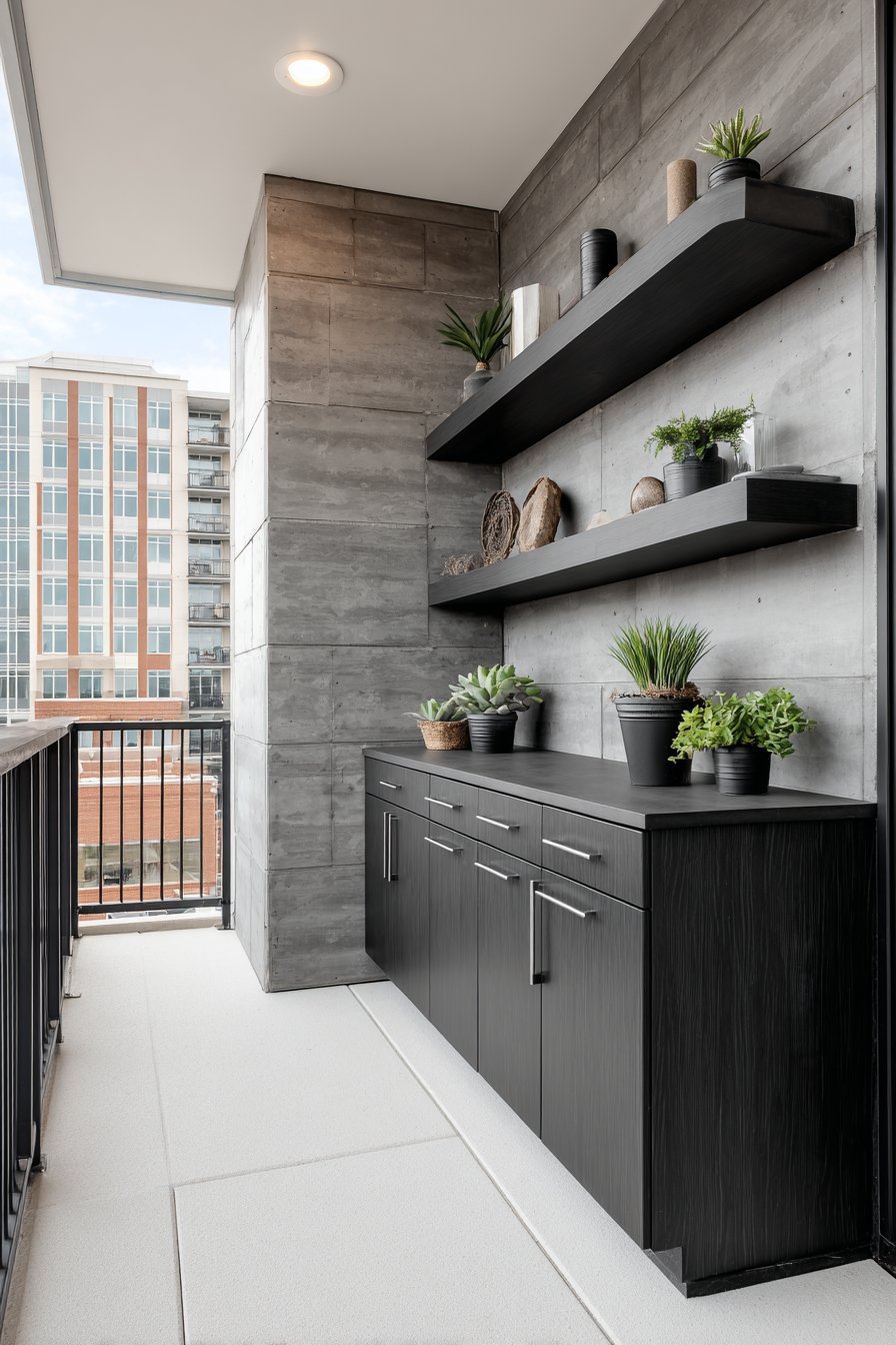 Modular units mount securely to the exterior wall. This provides storage without consuming floor space. Floating shelves in matching material display decorative objects. Potted succulents add living elements to storage area.