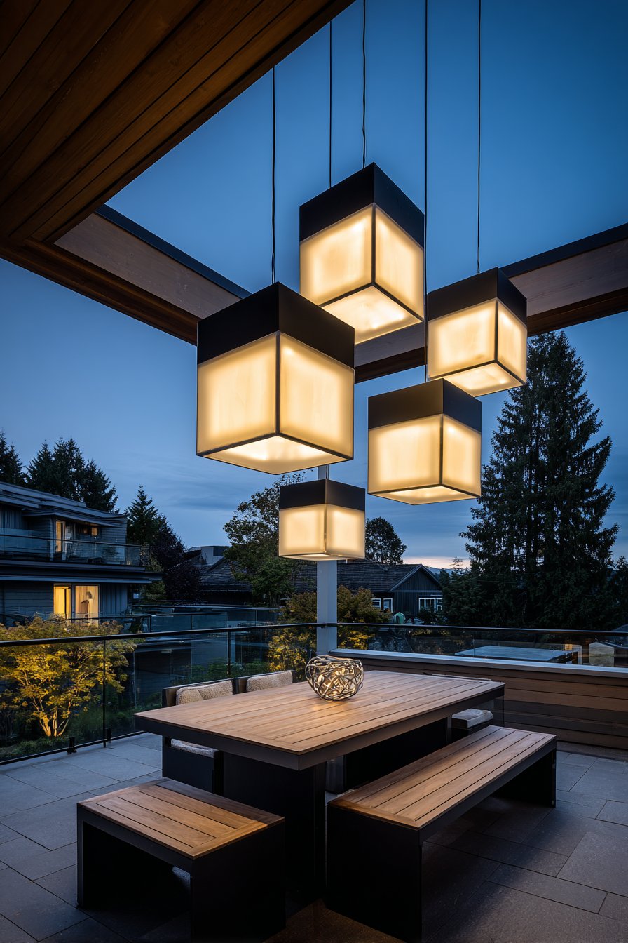 Thin aircraft cables suspend fixtures from pergola structure. This minimalist approach keeps focus on light fixtures. Below, solid teak dining table and benches gather. The lighting creates pools of warm illumination at twilight.