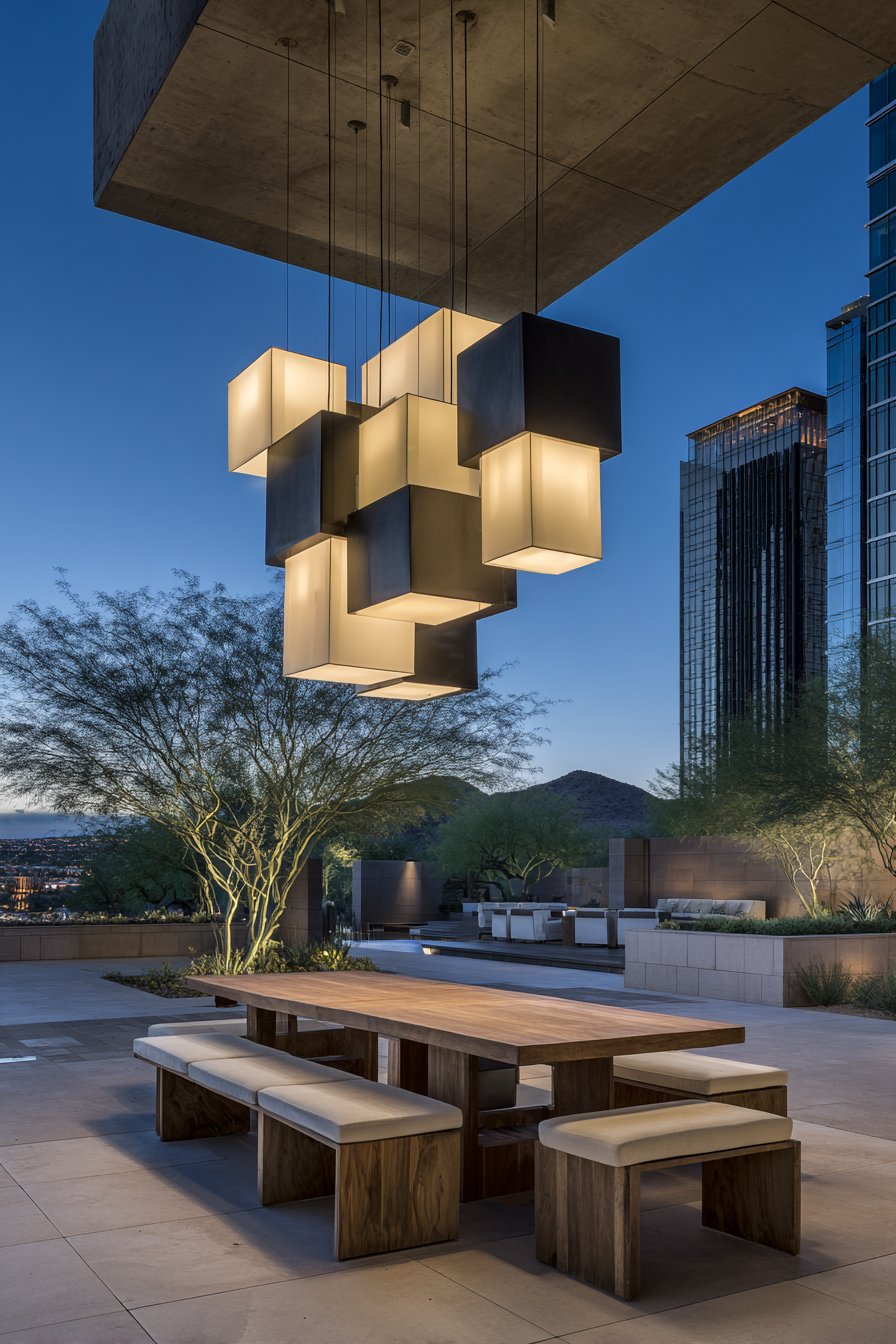 The installation demonstrates lighting as a sculptural element. Functional illumination becomes artistic statement. Attention to fixture details elevates simple outdoor dining. Material finishes coordinate throughout the design.