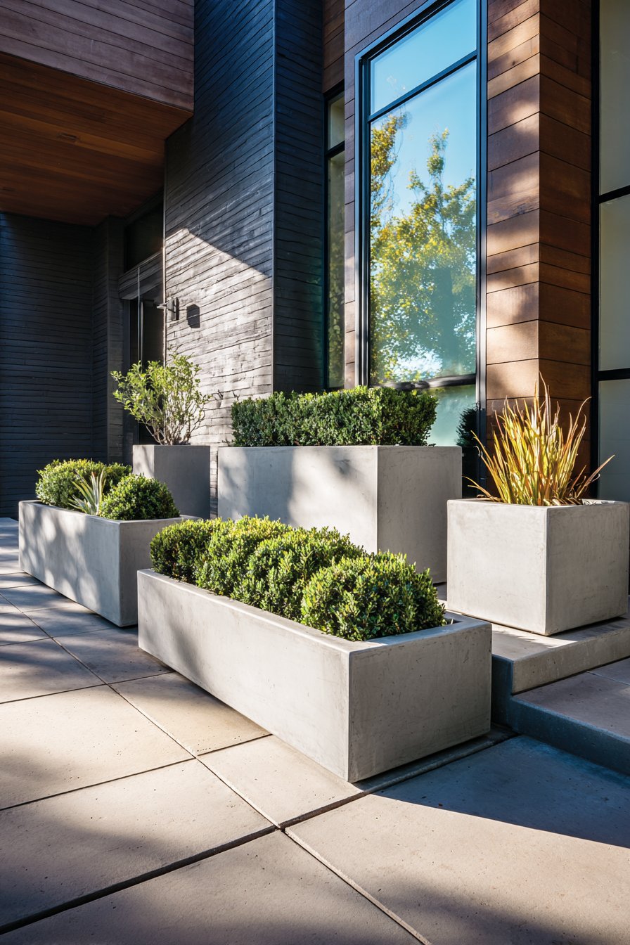 Rectangular concrete containers in smooth cast finish create impact. Natural grey color develops character with weathering. Structured hedges receive precise geometric trimming. The sculptural forms create living architecture.