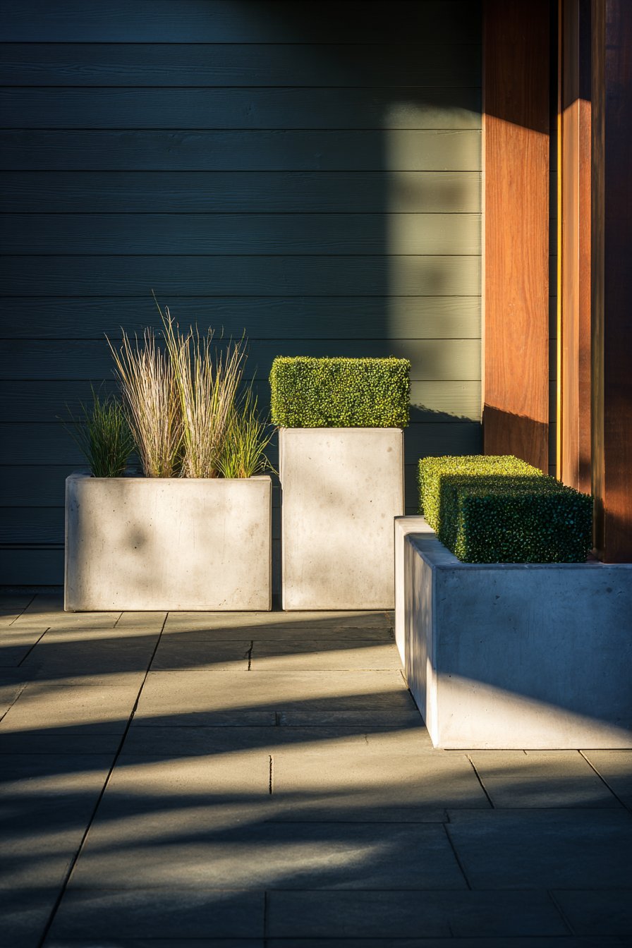 The arrangement demonstrates modern landscape design approach. Plants become architectural elements through selection and maintenance. Container gardening allows flexibility impossible with ground planting. Material quality ensures planters age beautifully.