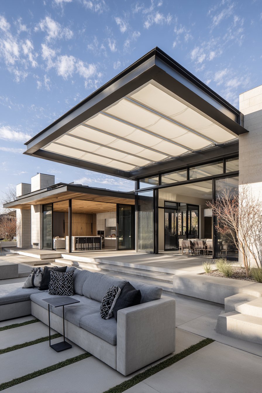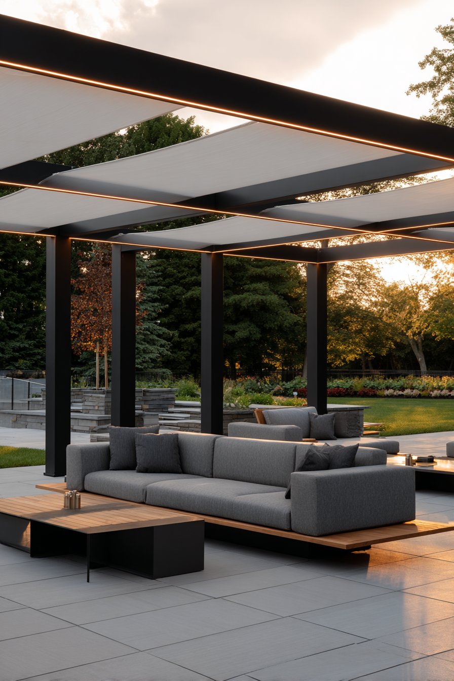 Clean-lined beams in powder-coated steel form an overhead grid. Matte black finish creates bold architectural statement. Retractable shade sails in white thread through framework. This provides adjustable sun protection throughout day.