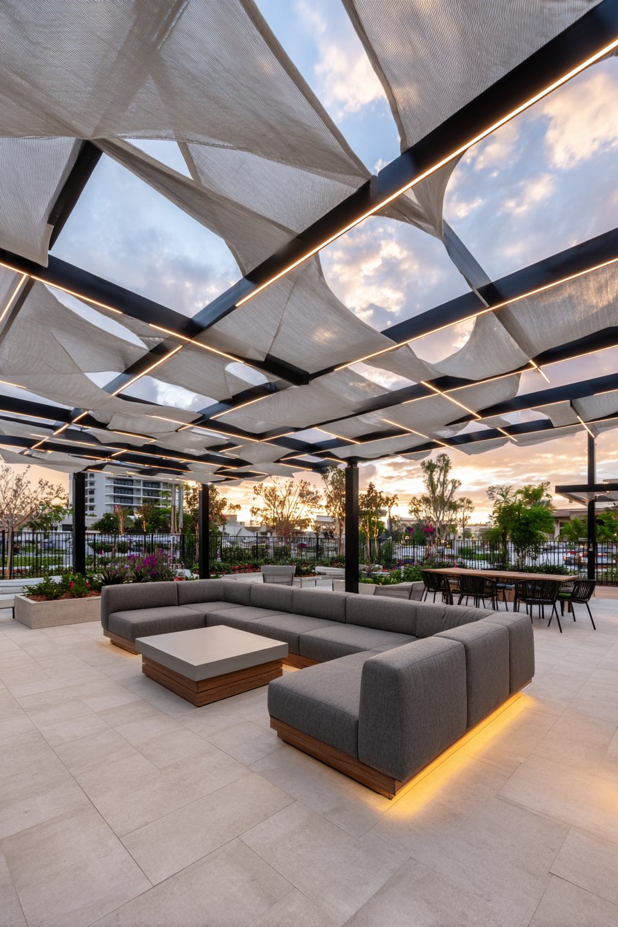 Integrated LED lighting strips mount within beam channels. This creates ambient evening illumination without visible fixtures. The lighting highlights the architectural framework beautifully. Golden hour filters through partially extended sails.