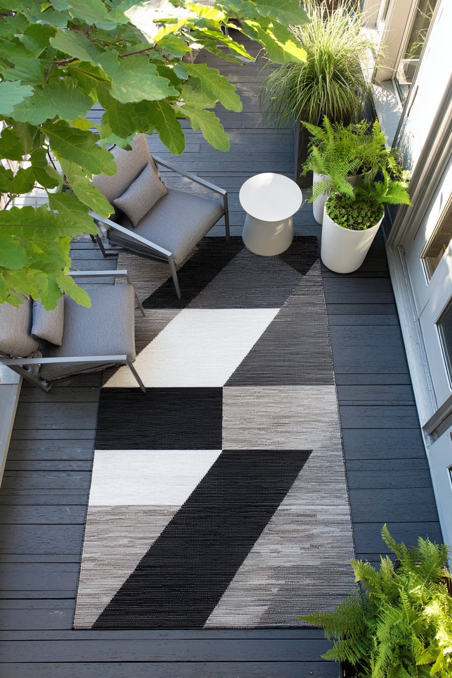 An outdoor rug anchors conversation area on composite deck. Bold geometric pattern features black, white, and charcoal. Solution-dyed acrylic fibers resist fading and mildew. The pattern defines seating zone clearly.