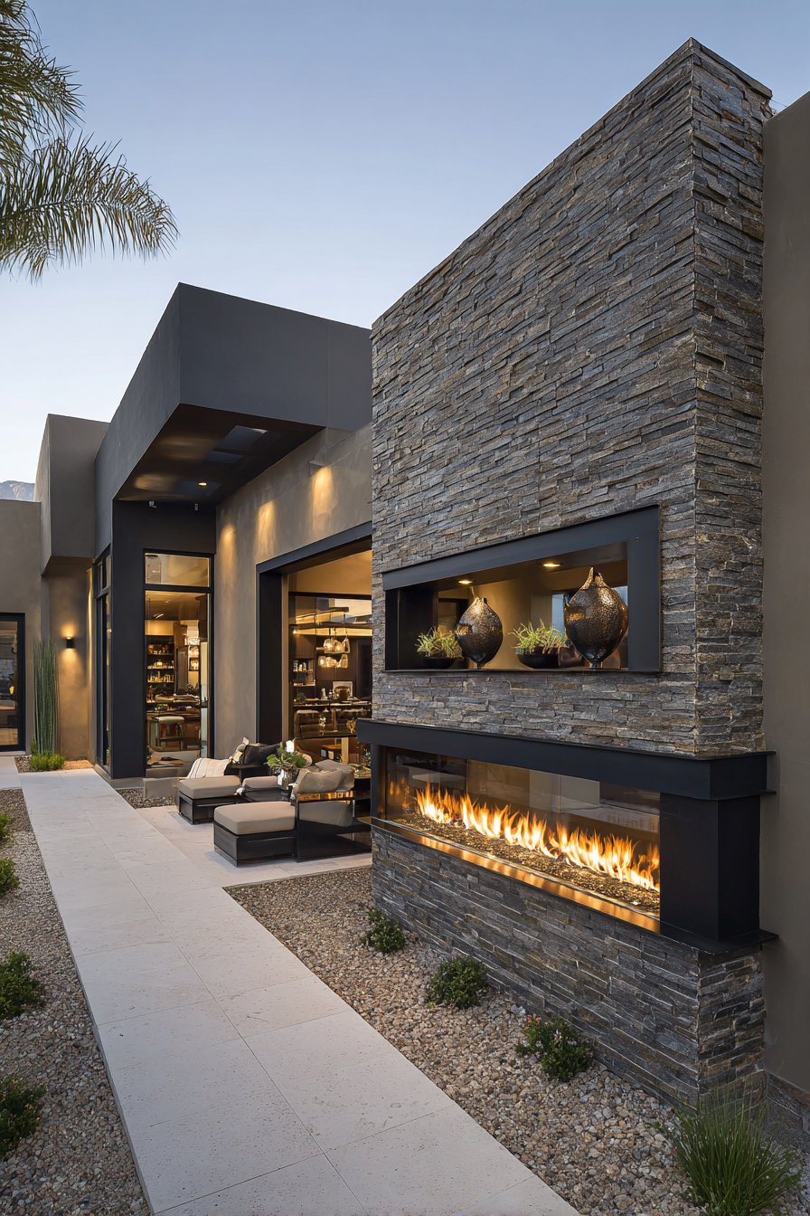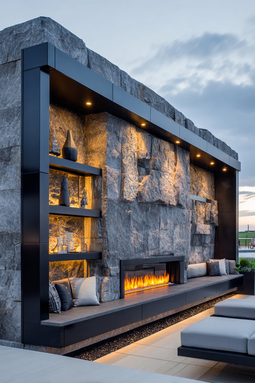 Natural stone pavers extend below matching wall material. This creates vertical and horizontal continuity. Evening photography captures fireplace illumination. Warm glow contrasts with textured wall surface.