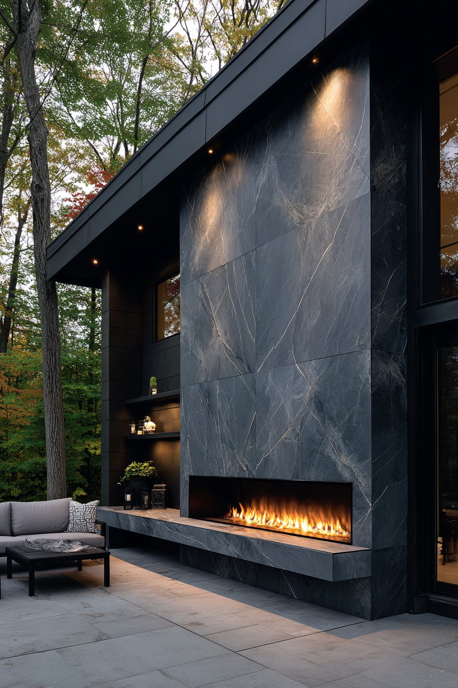 Large-format porcelain panels create dramatic accent wall. Charcoal grey with natural stone texture adds depth. Linear gas fireplace integrates seamlessly within wall. Contemporary black surround frames the flames.