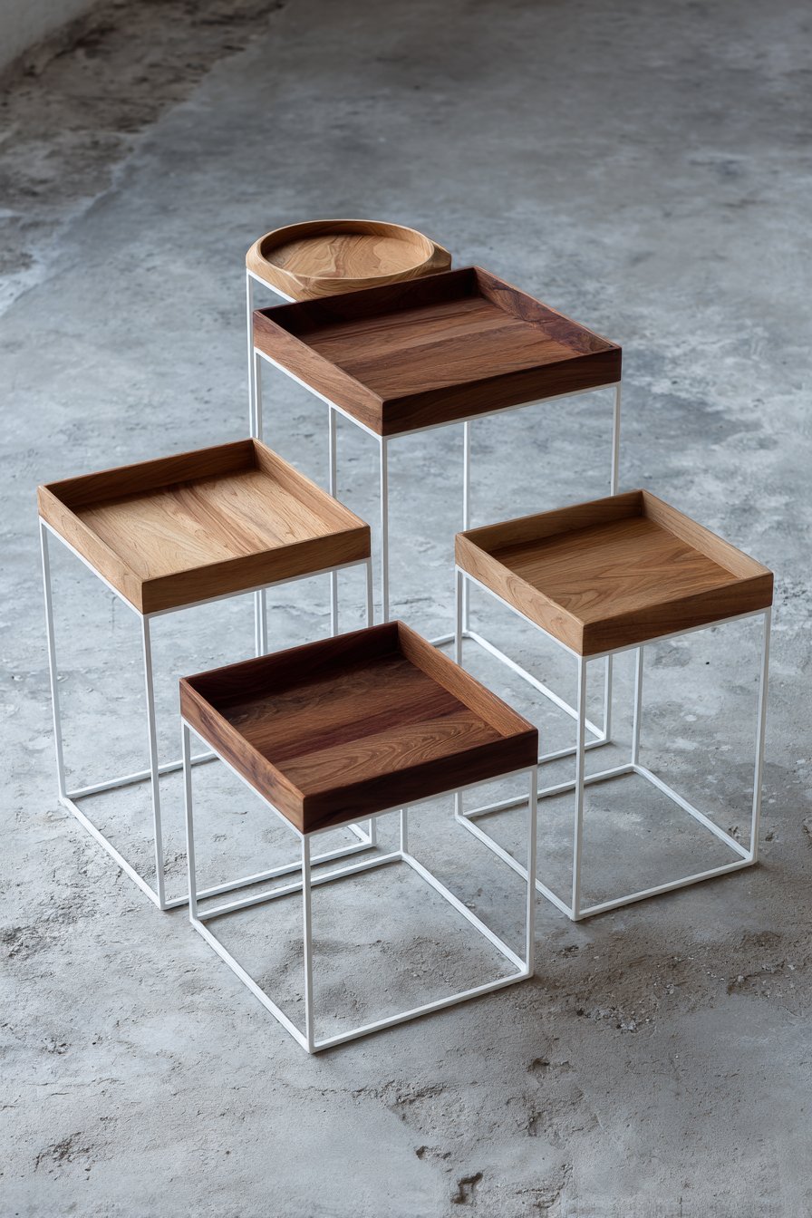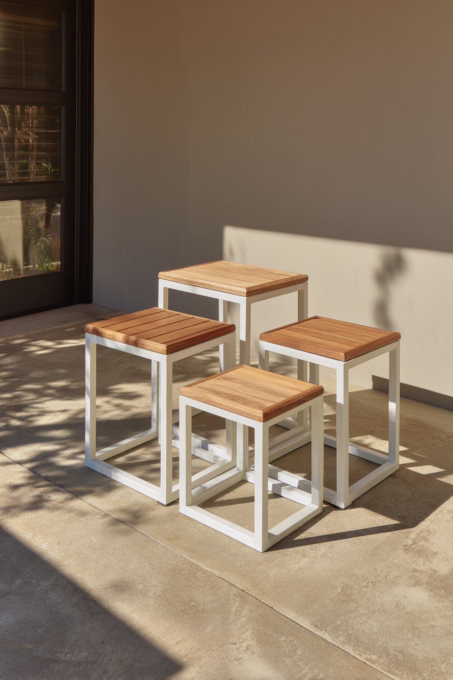 Nesting side tables provide flexible surfaces. Powder-coated steel frames in matte white create structure. Removable serving trays in solid teak add warmth. The clean geometric forms exemplify modern aesthetic.