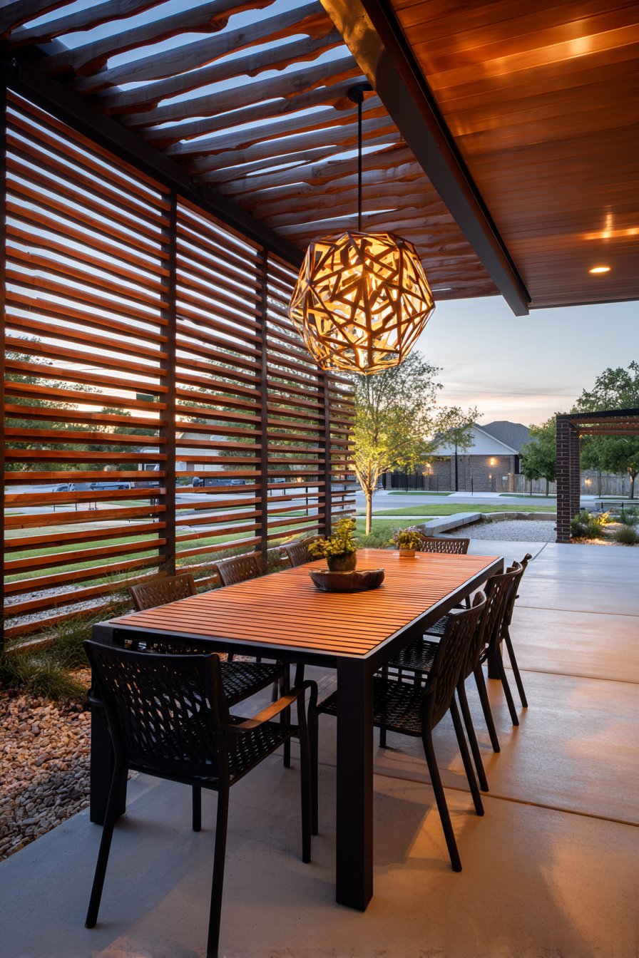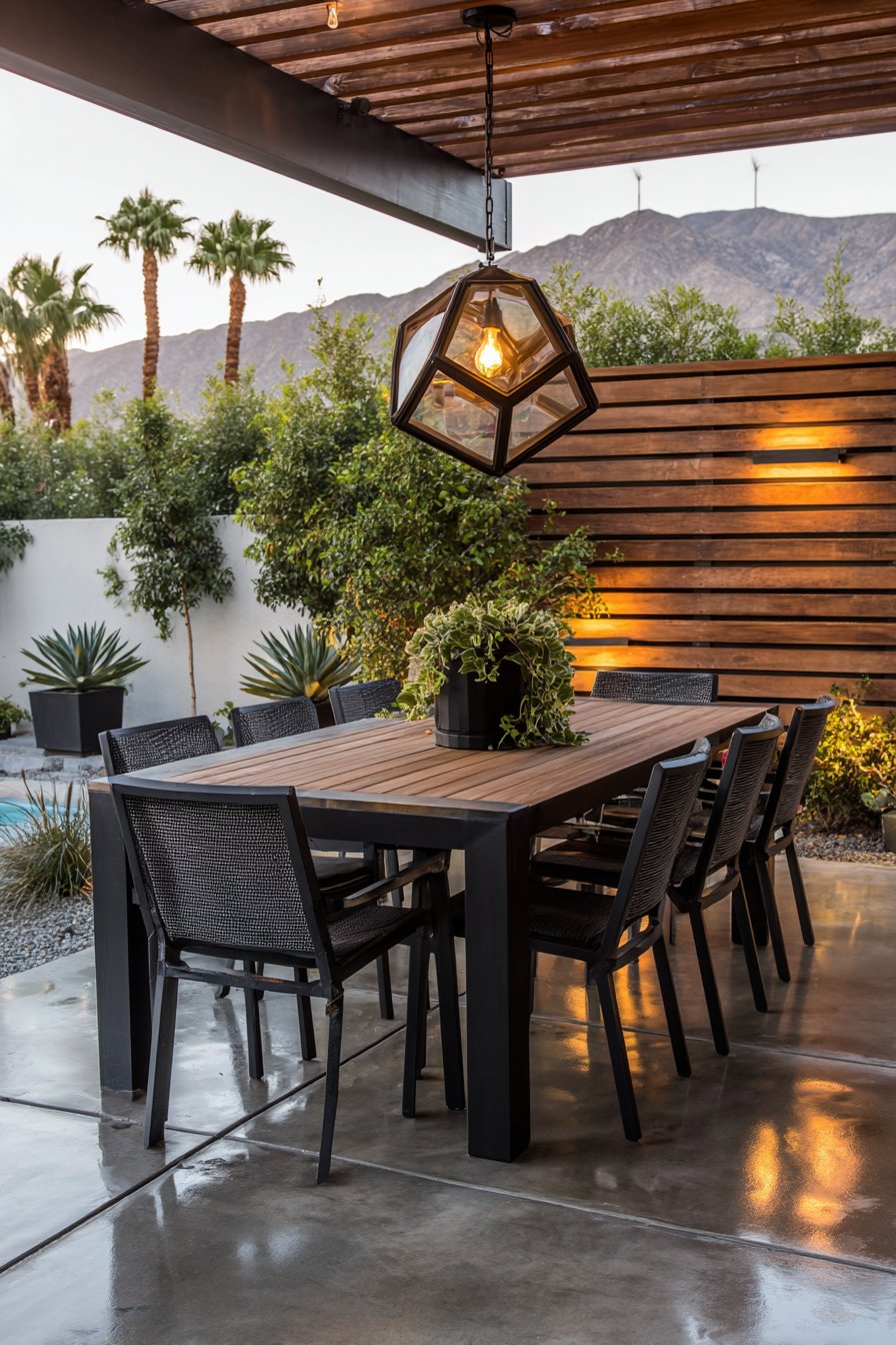 Breathable mesh backs provide comfort during extended meals. The stackable design offers practical storage when space requires flexibility. A contemporary geometric pendant fixture hangs centered above. Steel pergola beams support the striking overhead lighting.